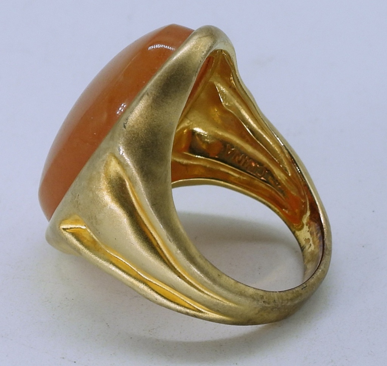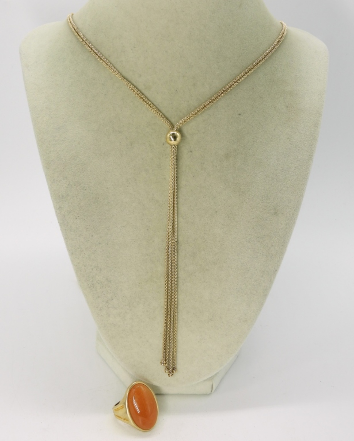 Sterling Gold Tone Carnelian Ring, size 8. Mesh style, long sterling gold tone fashion necklace (tested as sterling), 40″ adjustable. (14.5 dwt)