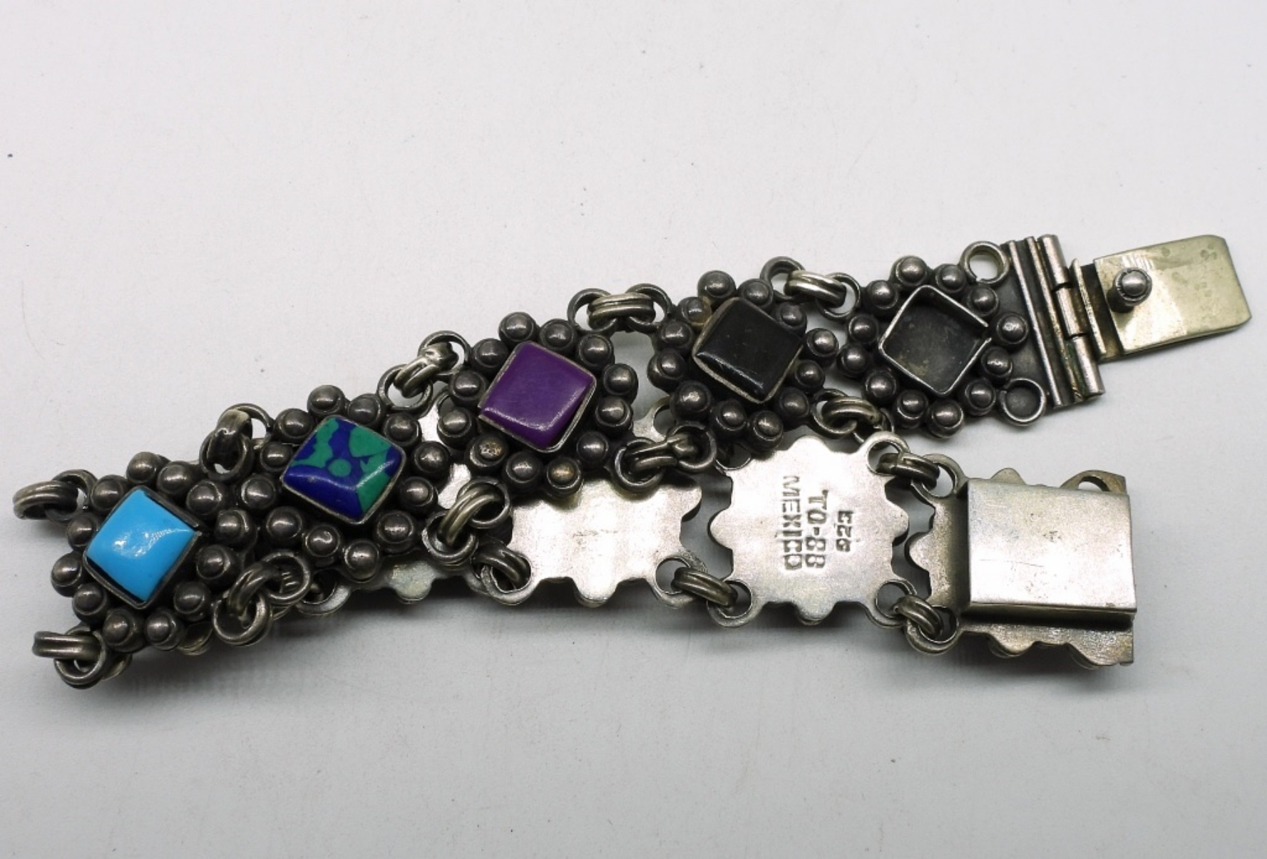 Taxco Mexico “TO-88 925 Mexico” bracelet with one missing gemstone. Lapis, Turquoise, Black Onyx. 7.5″. (28.2 dwt)