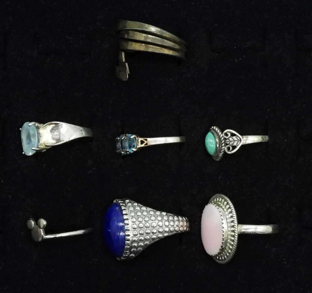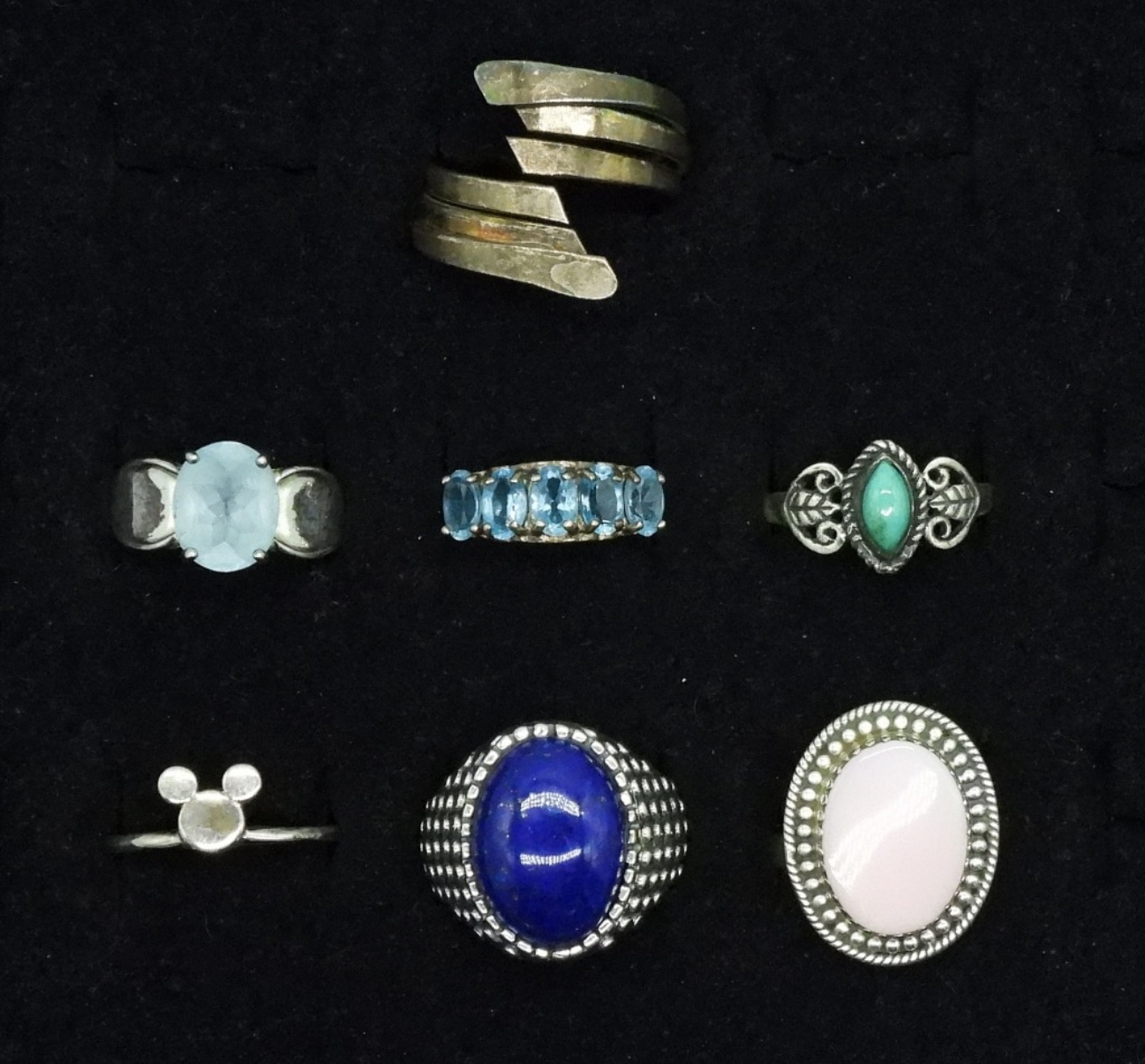 Seven sterling rings, sizes 6-10. Blue topaz, Turquoise, Lapis lazuli, Mickey Mouse. (21 dwt)