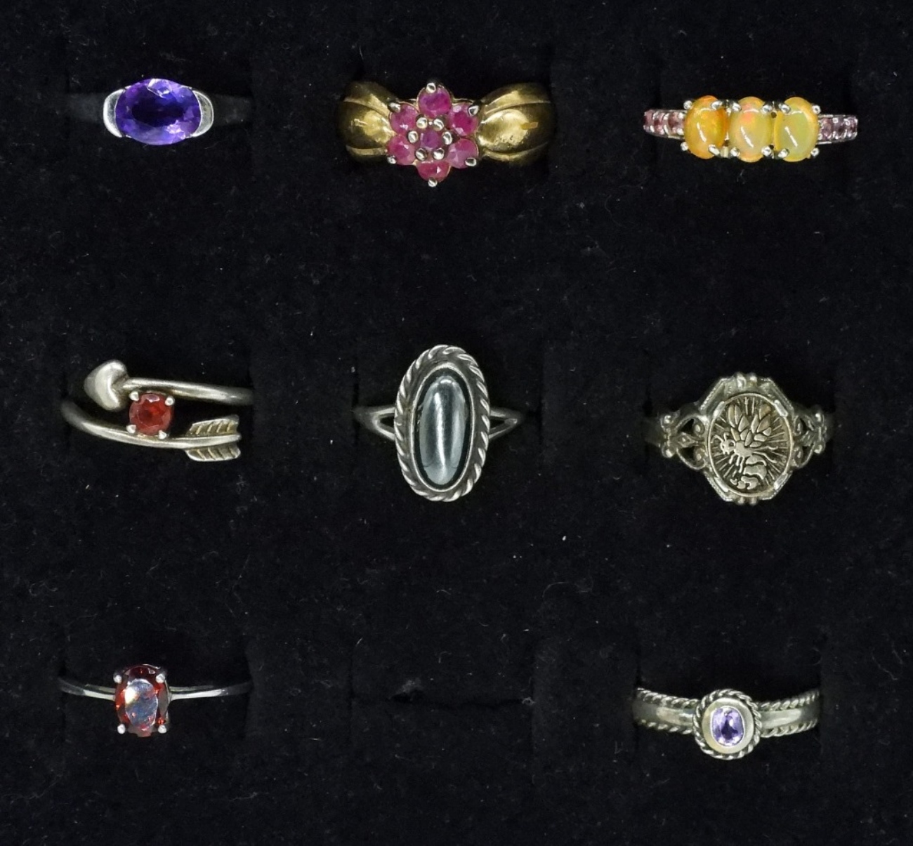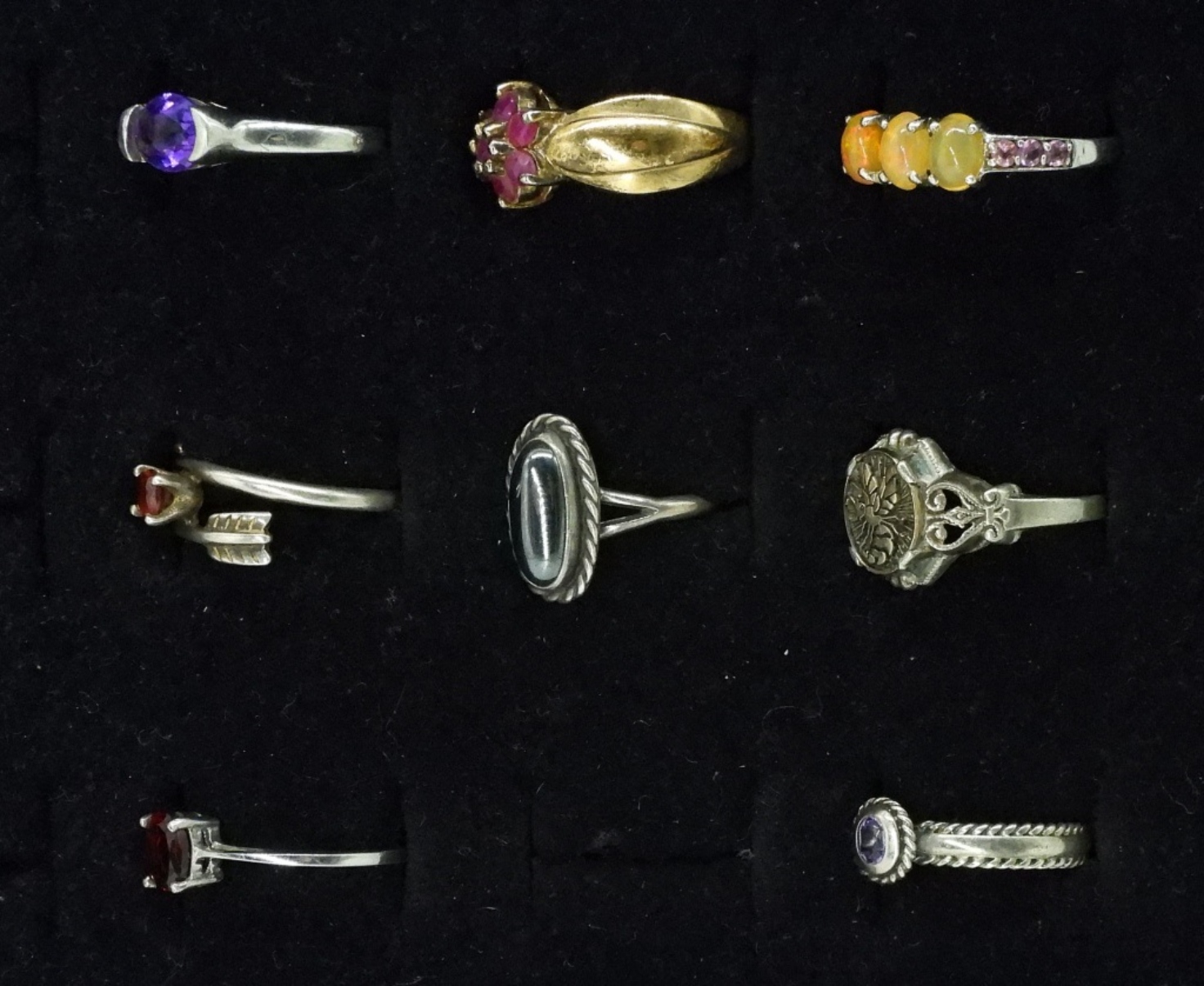 Eight sterling rings, sizes 5-8. Amethyst, Garnet, Ruby, Yellow Opal, Hematite. (13.4 dwt)