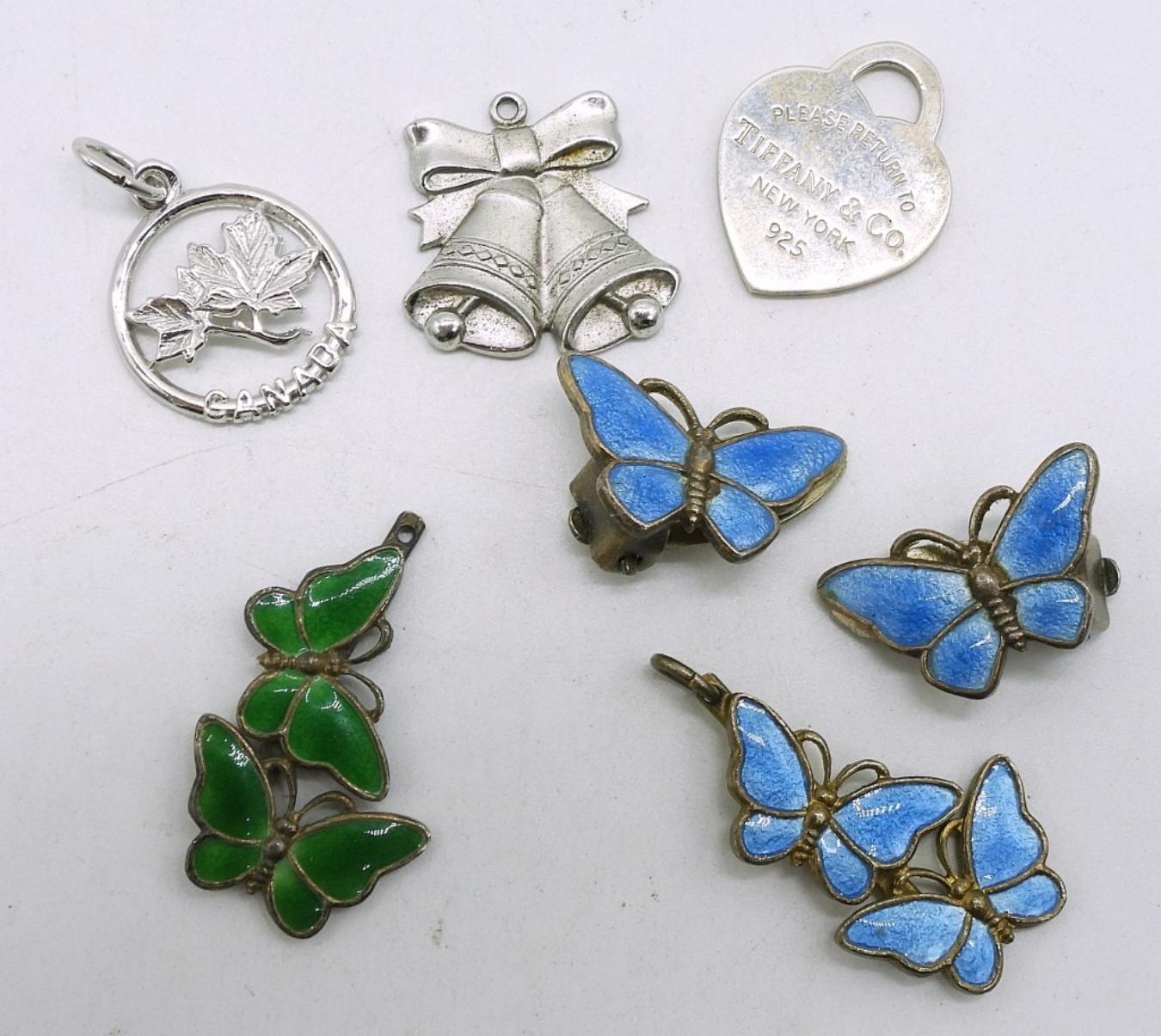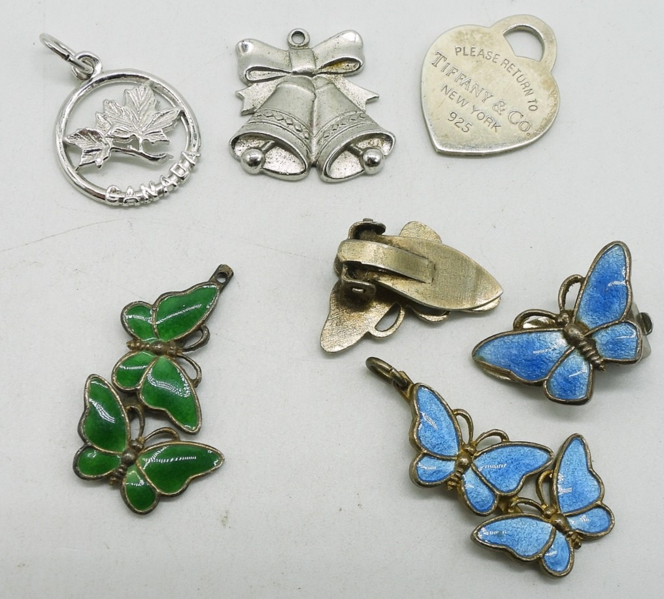 Five sterling pendants, one pair of blue butterfly clip on earrings. (11.2 dwt)