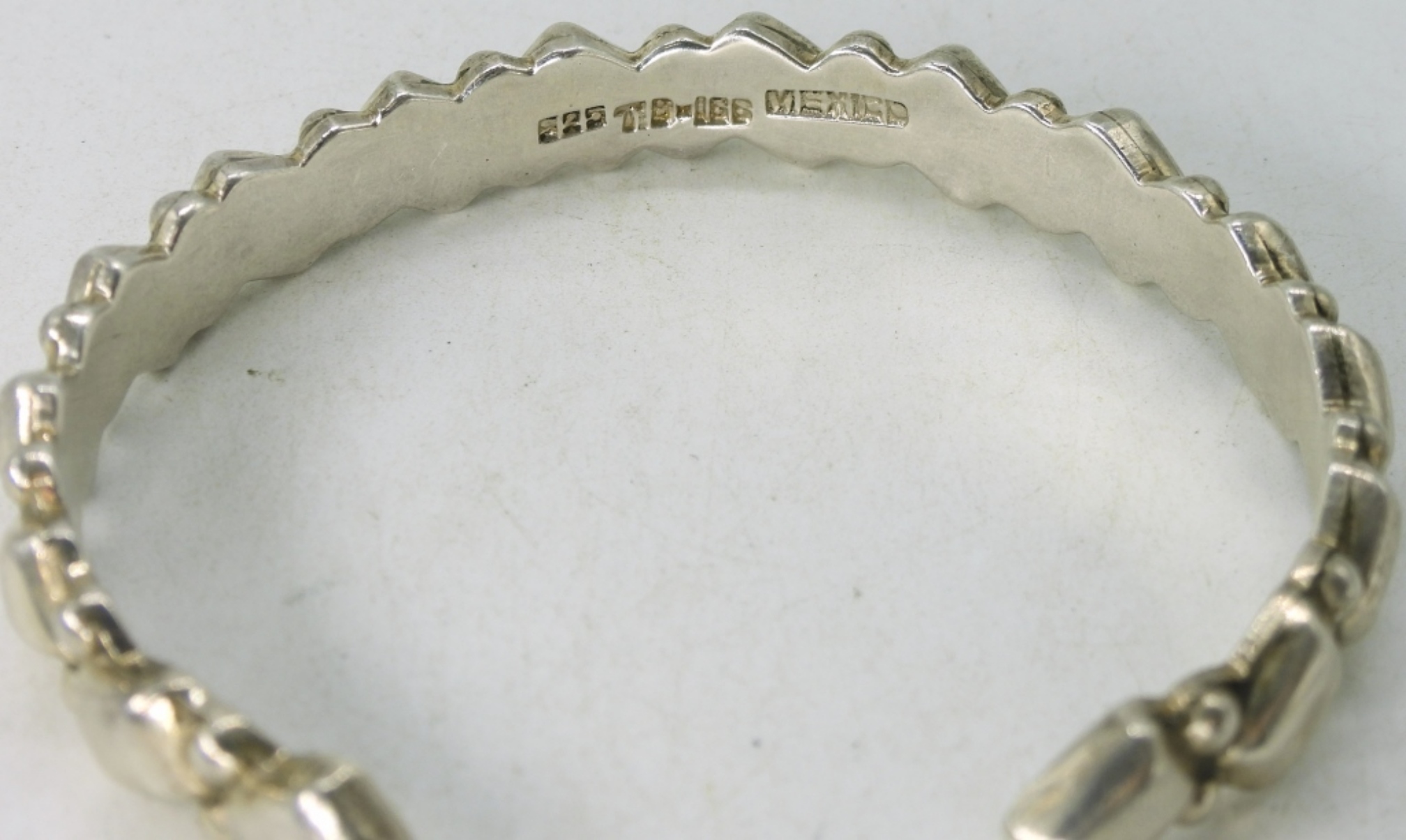 Two sterling Taxco bracelets. “TB-166” & “TO-13”. Ring size 8. Sterling pierced hoop earrings. (46.9 dwt)