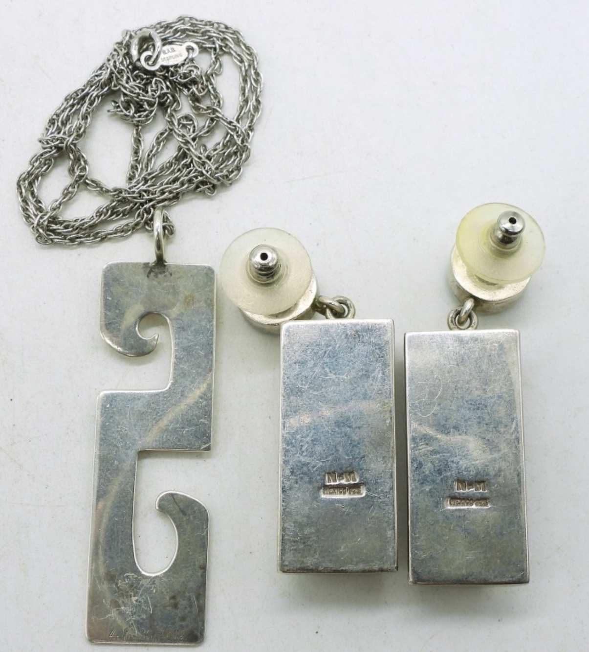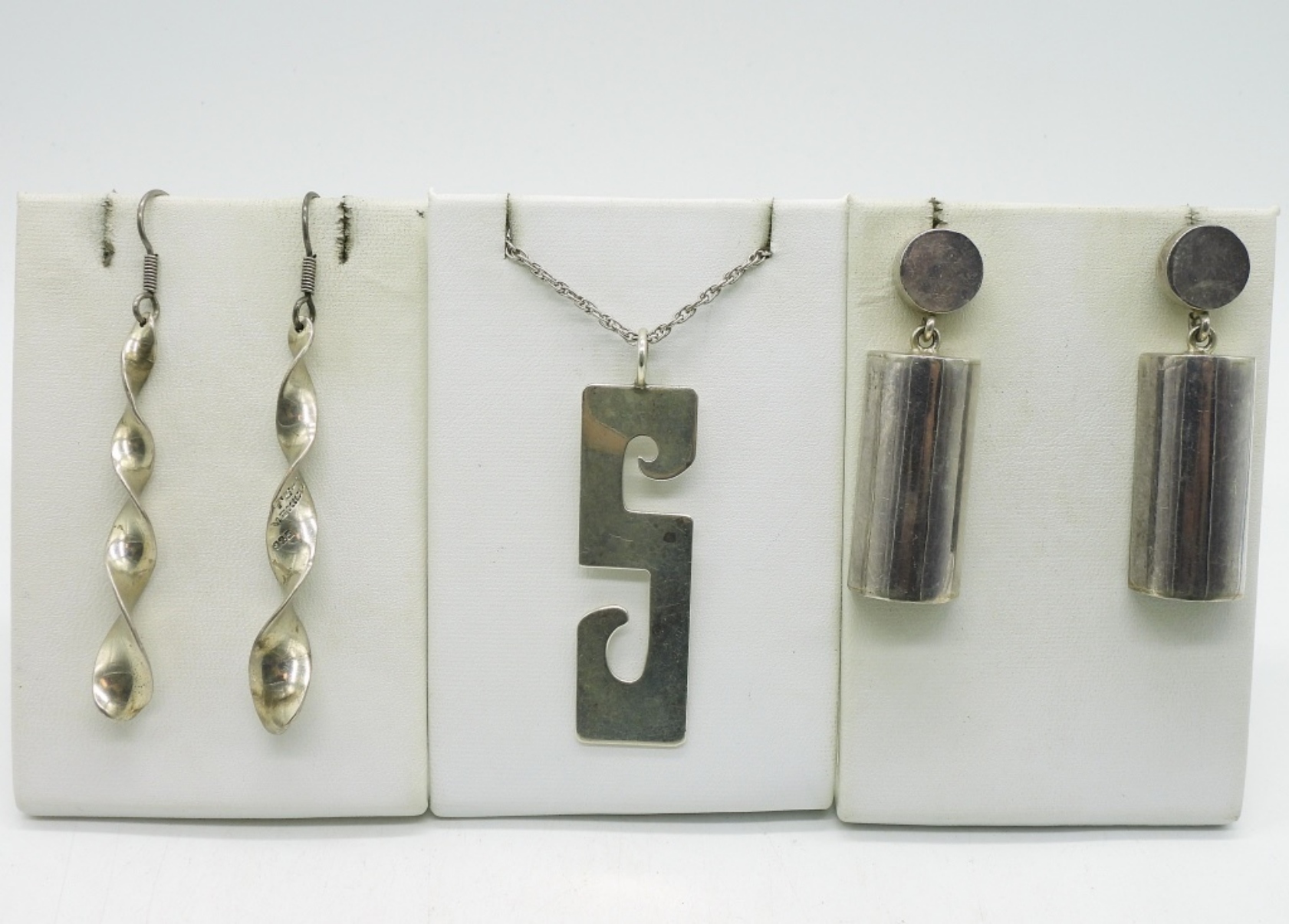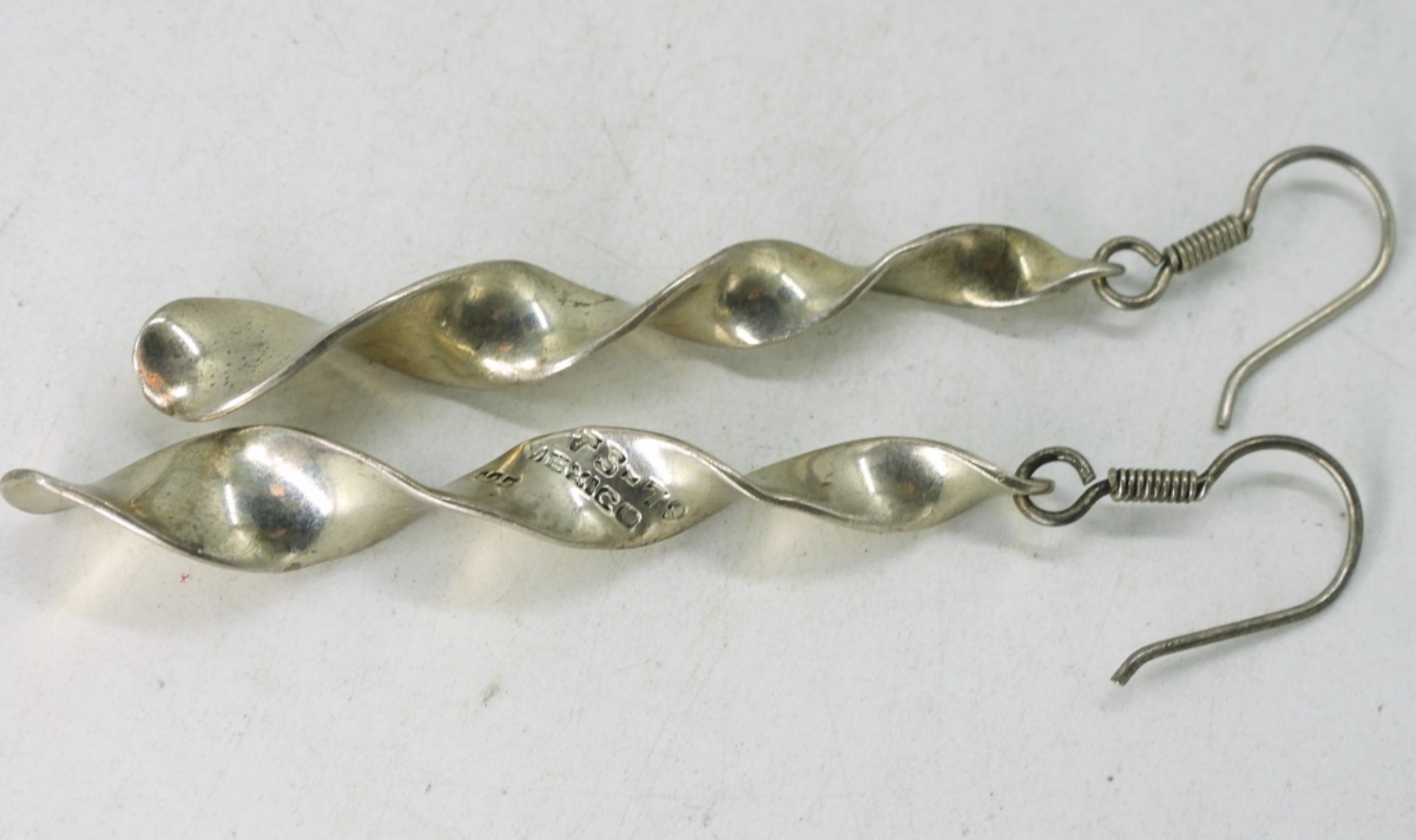 Spiral sterling pierced earrings, Taxco, marked “TS-79 Mexico 925″. 3″ long. Cylindrical pierced earrings, 2”. “S” sterling necklace, 24″. (29.2 dwt)