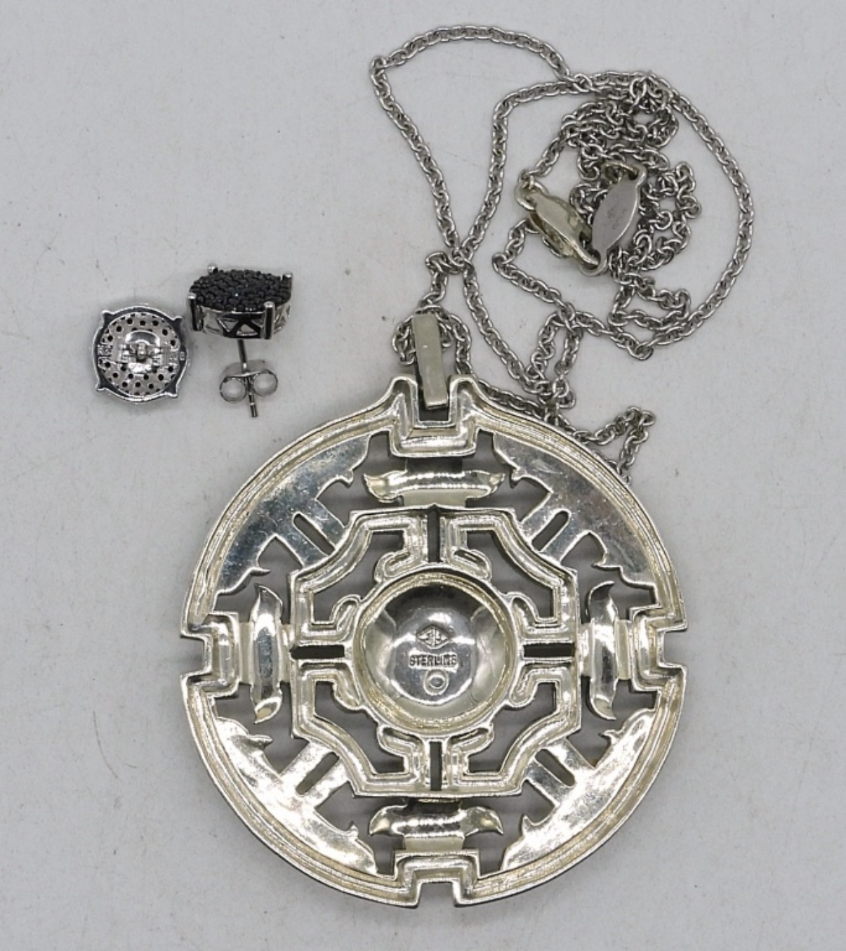 Large sterling pendant with lots of marcasite, 2.5″ long. 20″ sterling chain. Black druzy pierced earrings. (23.5 dwt)