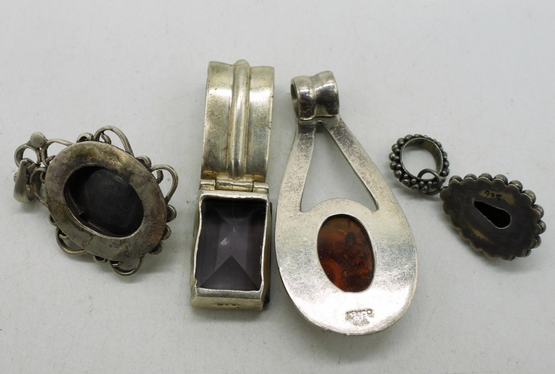 Four sterling pendants. Amber, Amethyst, Black Onyx, Labradorite. 1″ – 2″. (25 dwt)