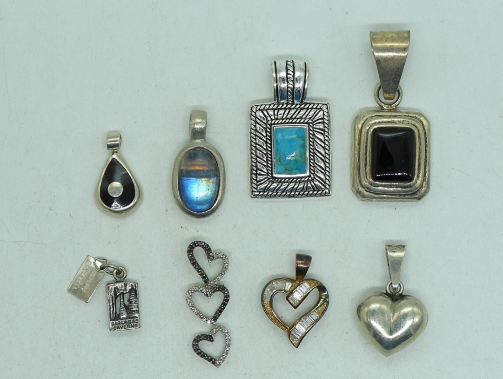 Eight Sterling Pendants, one gold tone. Simulated diamonds, turquoise, onyx & labradorite. (25.5 dwt)