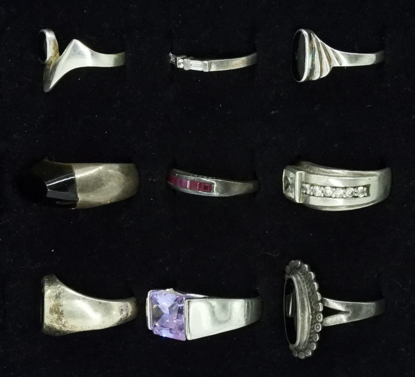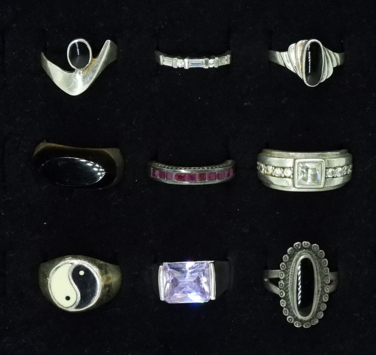 Nine sterling rings. Black onyx, garnet, amethyst, faux diamond. Sizes 7-9 (35 dwt)