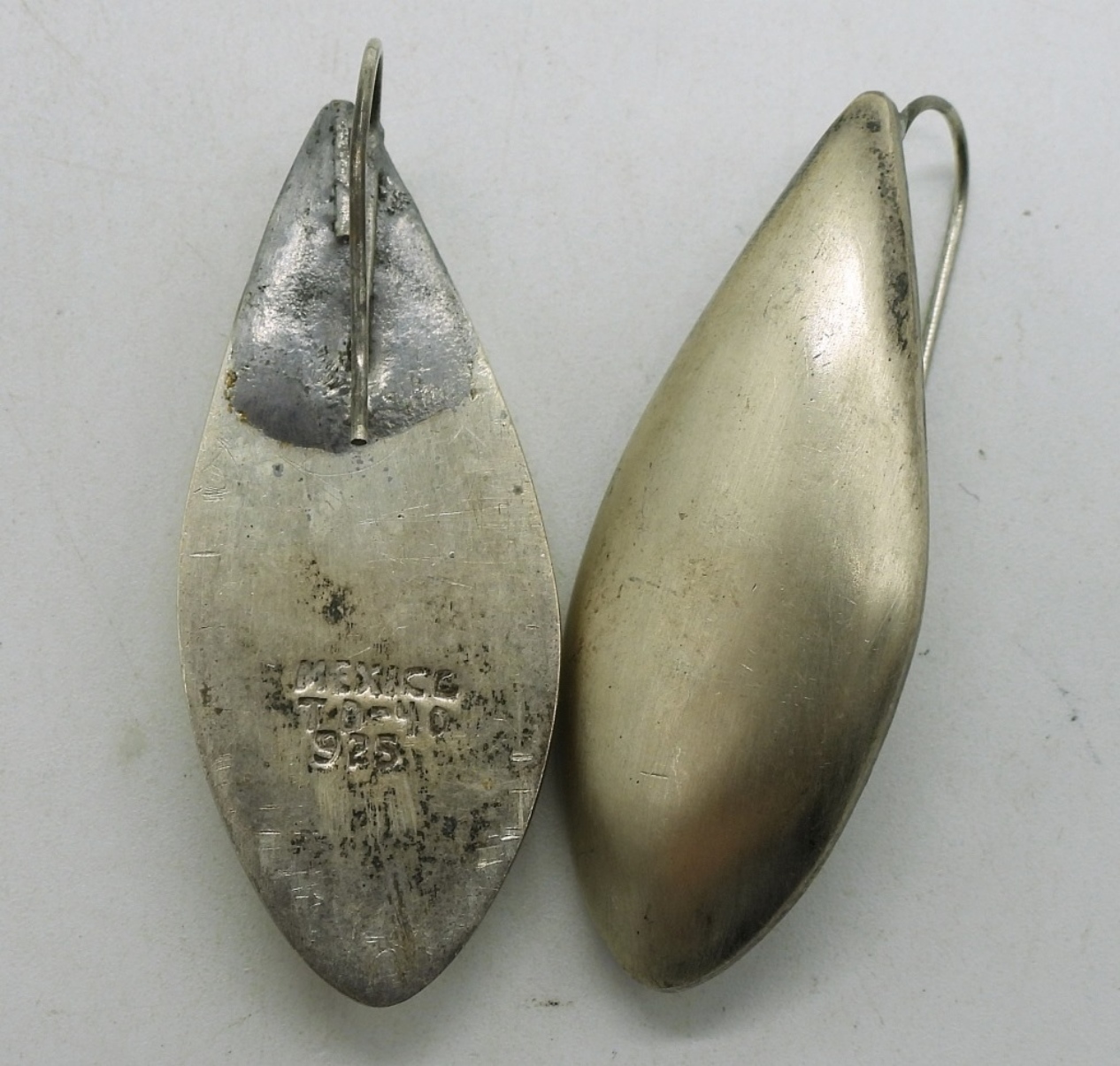 Three pair of sterling earrings, Taxco (TD-40), 2″. Gold tone (gold filled) sterling earrings, 1″. Third pair is 1.5″ long. (24 dwt)