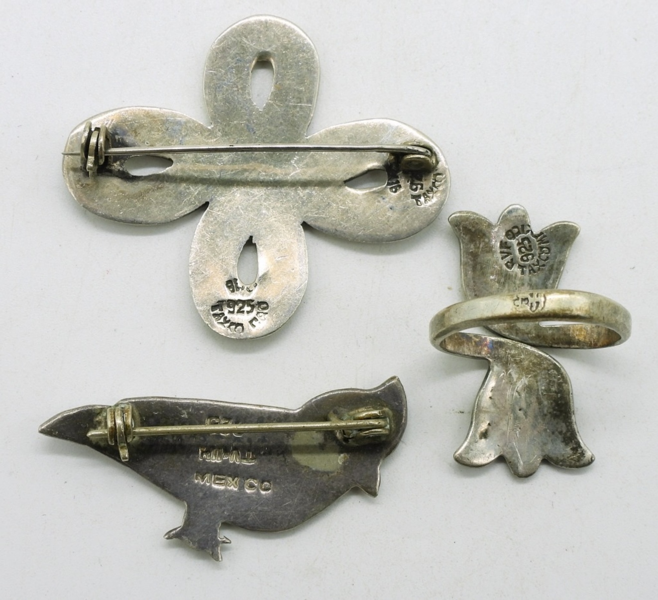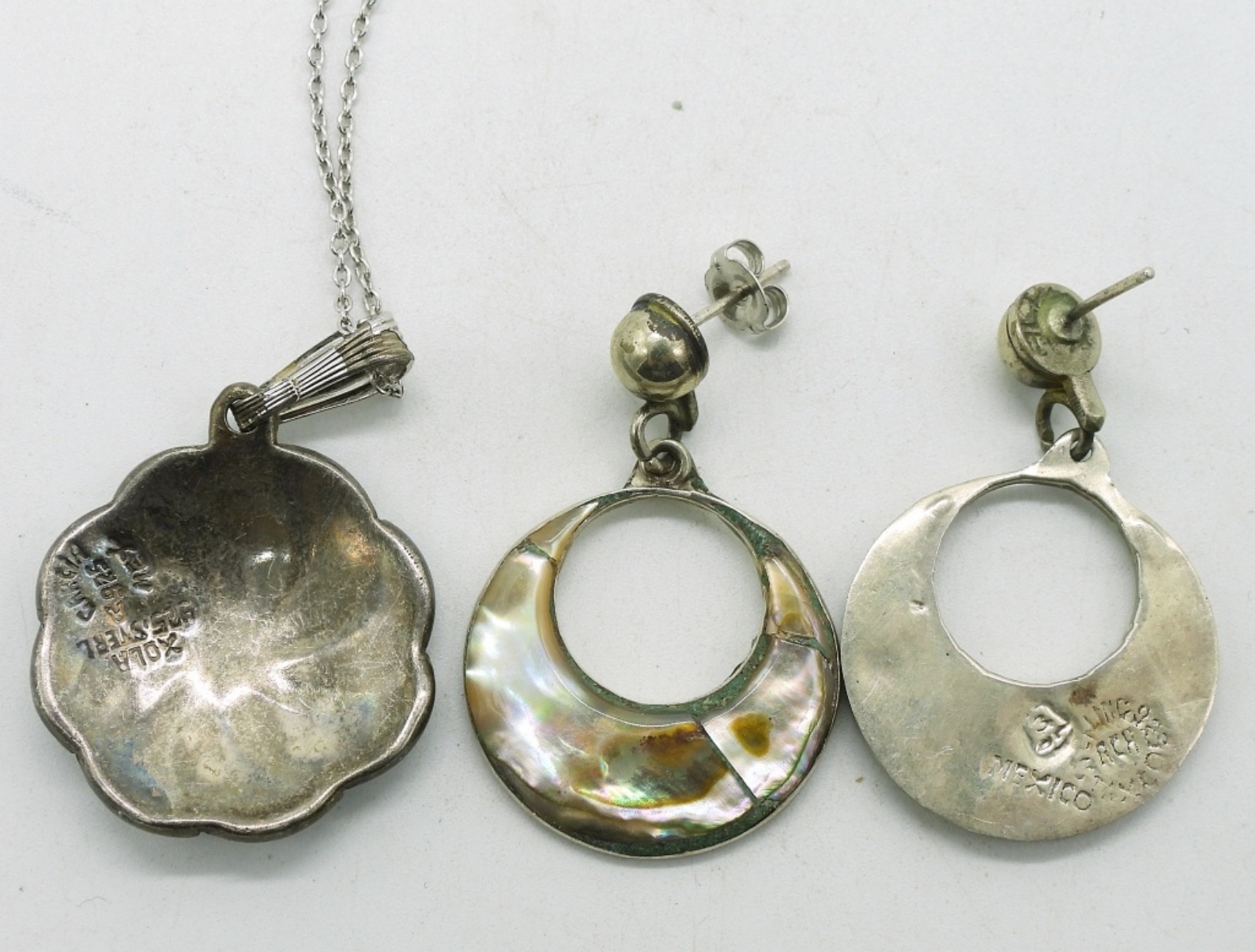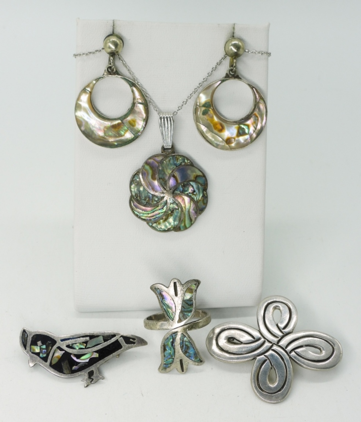 Vintage Sterling & Abalone. Necklace, 18″. Pierced Taxco Earrings with abalone, 1.5″. Taxco ring, size 7. Two Taxco brooches. (15.8 dwt)