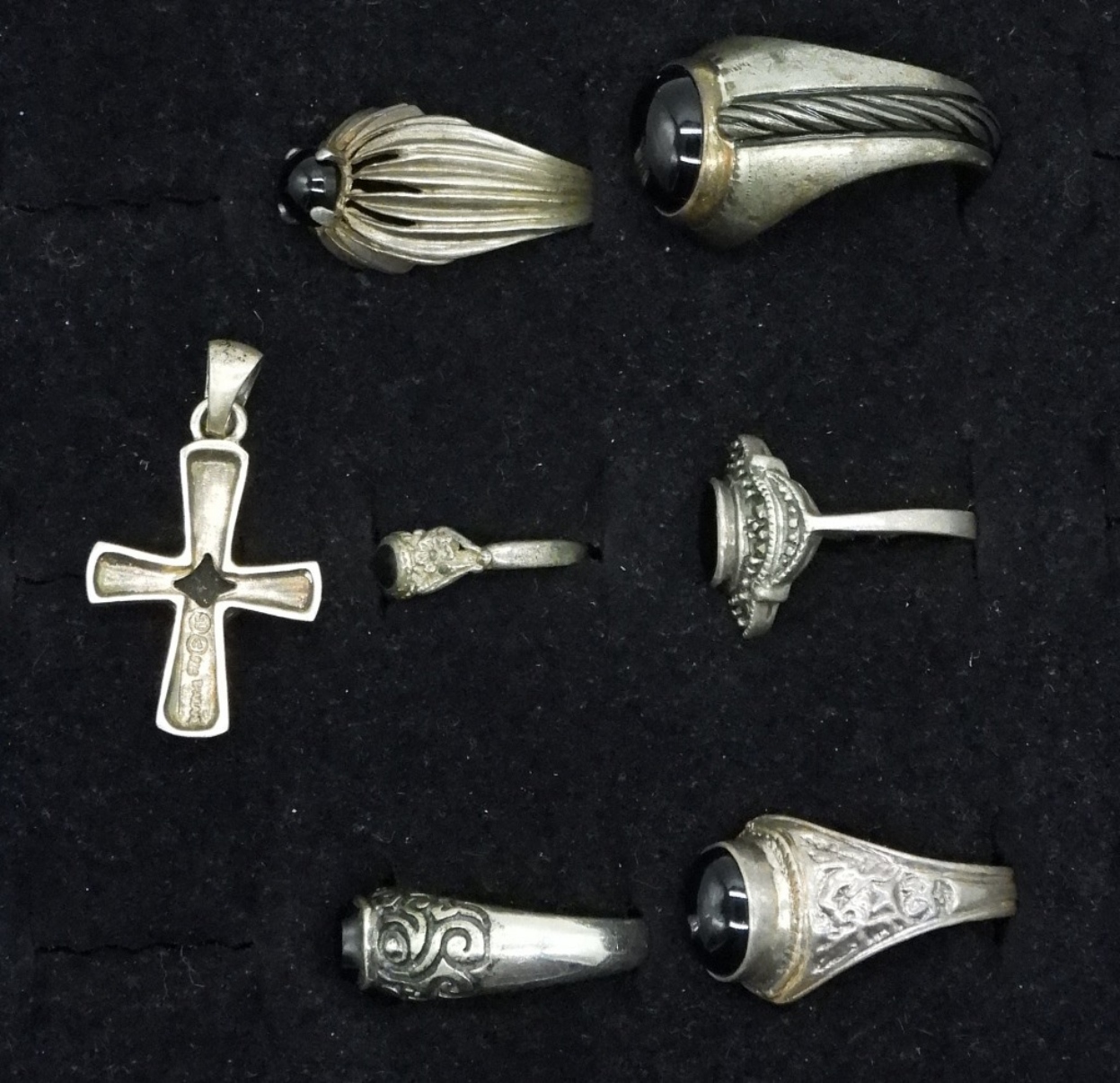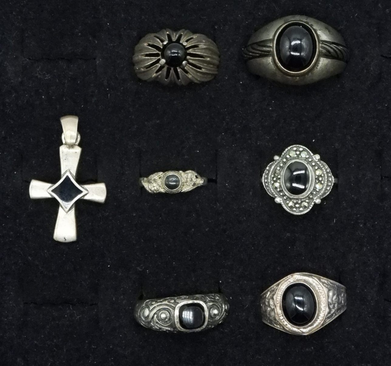 6 sterling rings with black onyx gemstones. Sizes 3-11. Sterling cross pendant, 1″. (23.5 dwt)