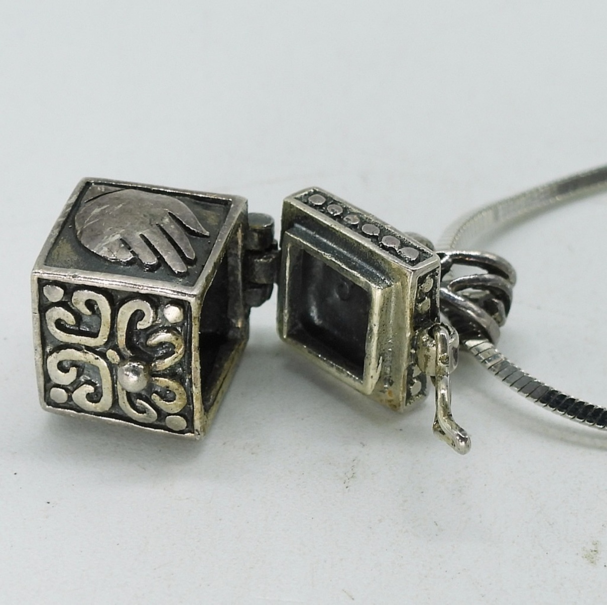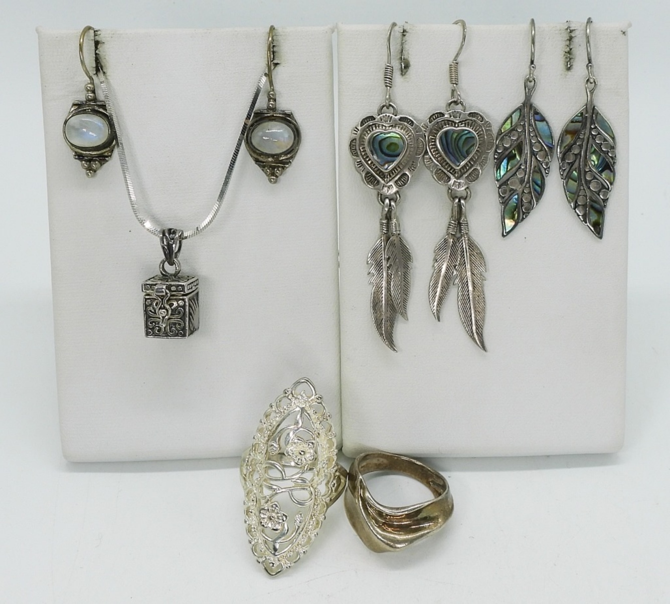 Three pair of sterling pierced earrings with moonstone & abalone, 1-2.5″. Two sterling rings, sizes 7 & 9. Sterling necklace with pendant that opens, 24″. (23 dwt)