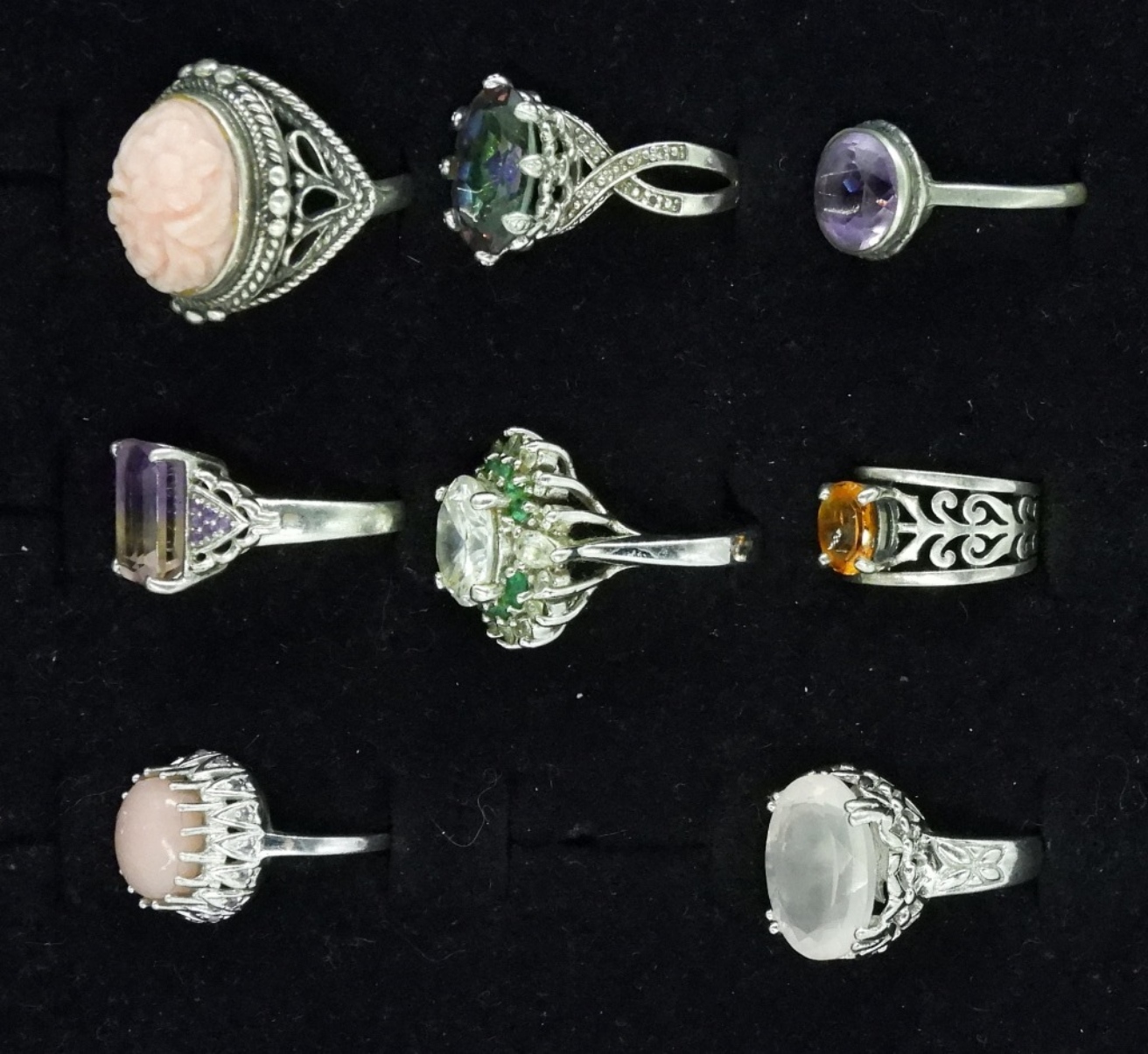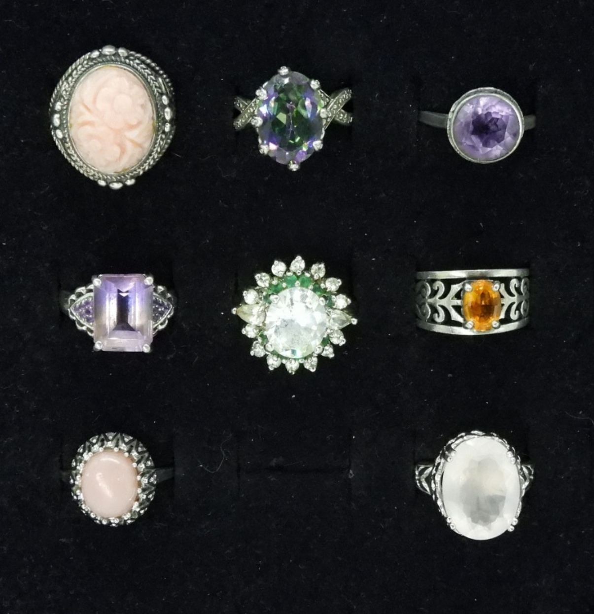 8 Sterling Rings. Coral, Amethyst, Rose Quartz, Mystic Topaz & More. Sizes 5.5-8.5 (29.8 dwt)