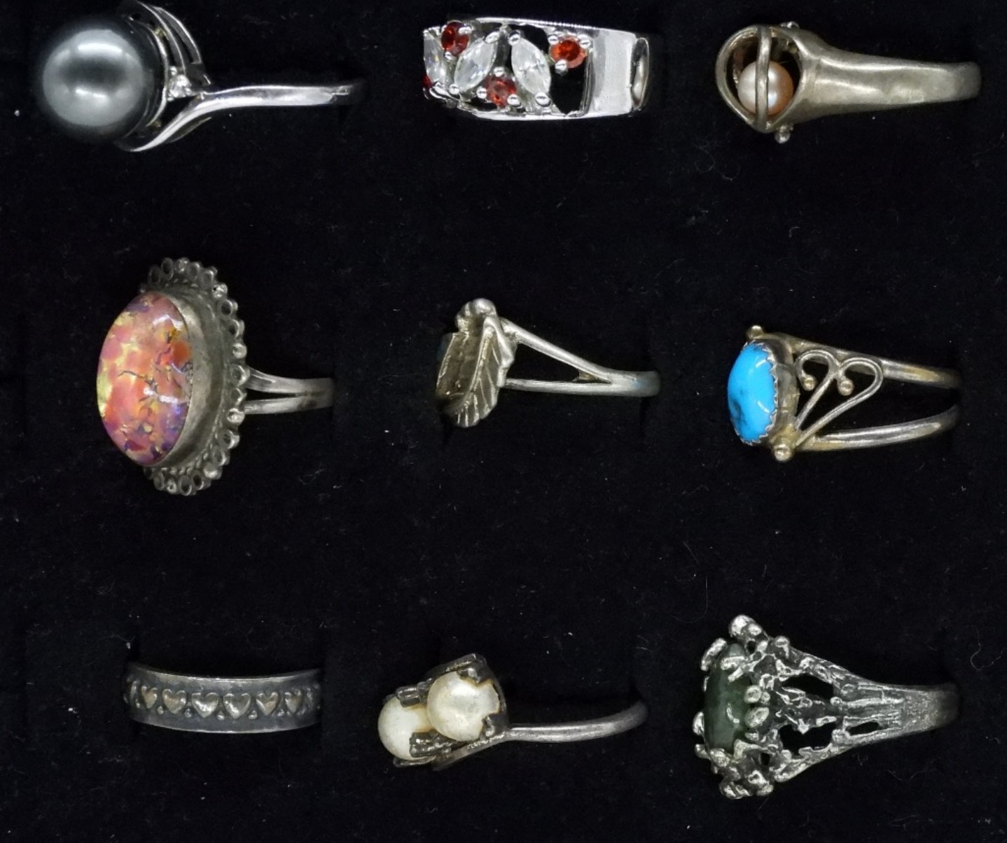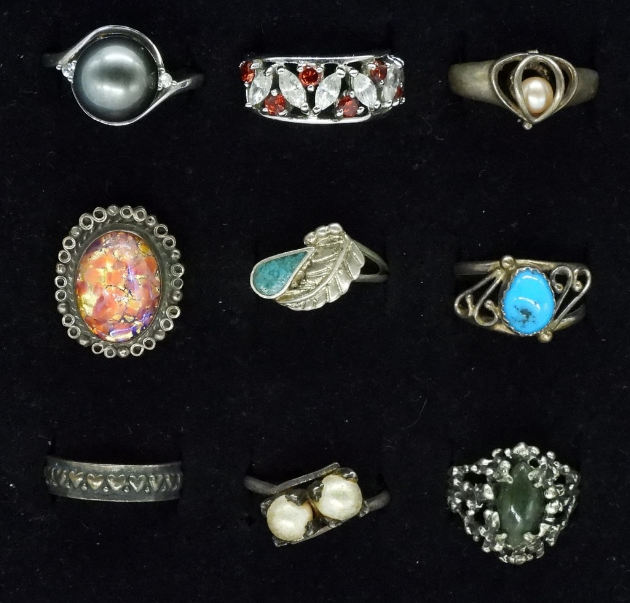 Nine sterling rings. Pearls, Turquoise, Simulated diamond / ruby. Sizes 5.5-10 (25.7 dwt)