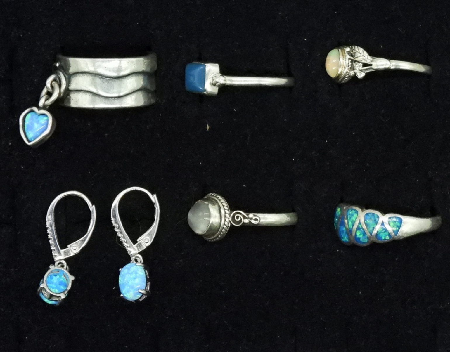 Five sterling rings with opals & clear gems. Sizes 8-9. One pair of opal pierced earrings, 1″. (12.8 dwt)