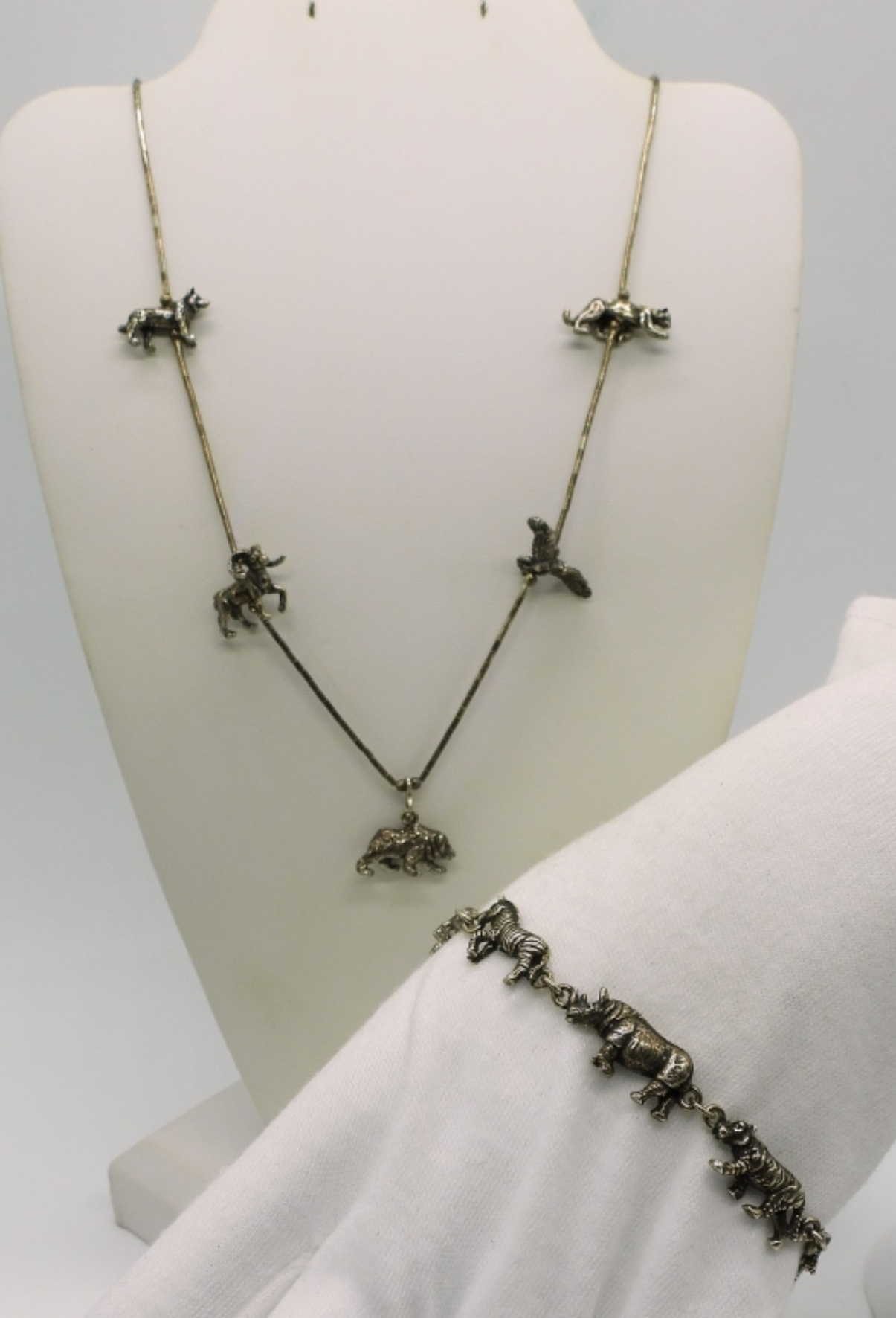 Liquid sterling necklace with 5 safari animal beads, 18″. Bracelet is 8″. (17.9 dwt)