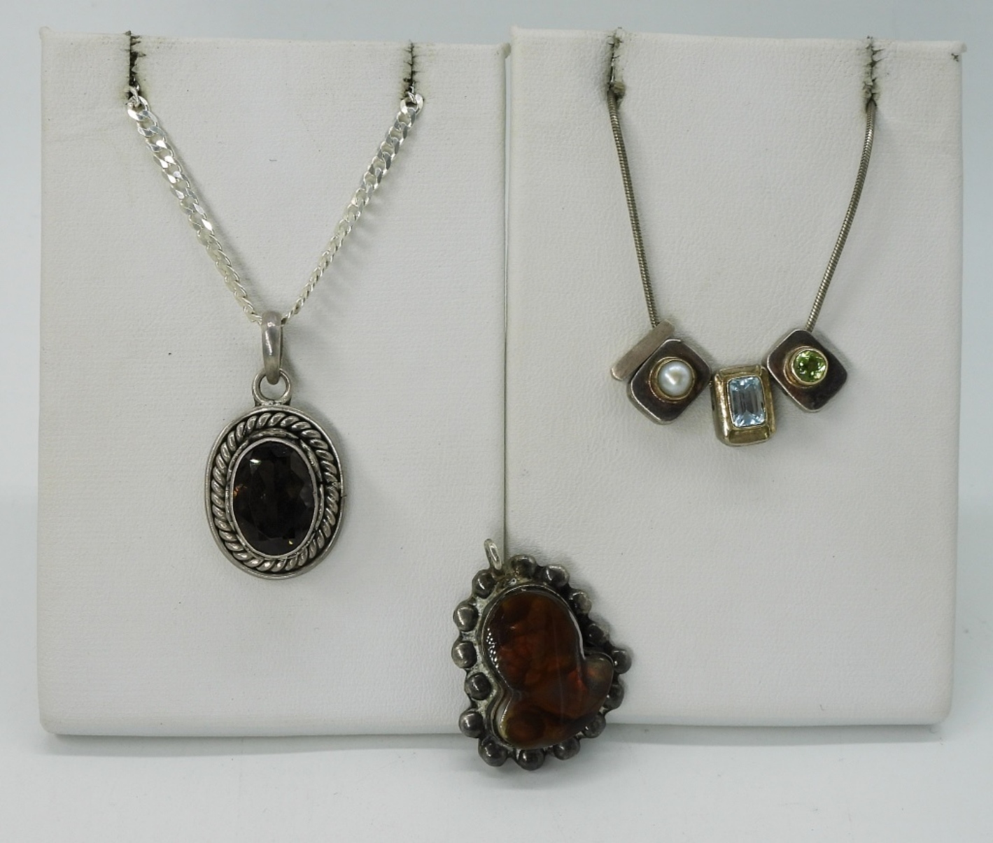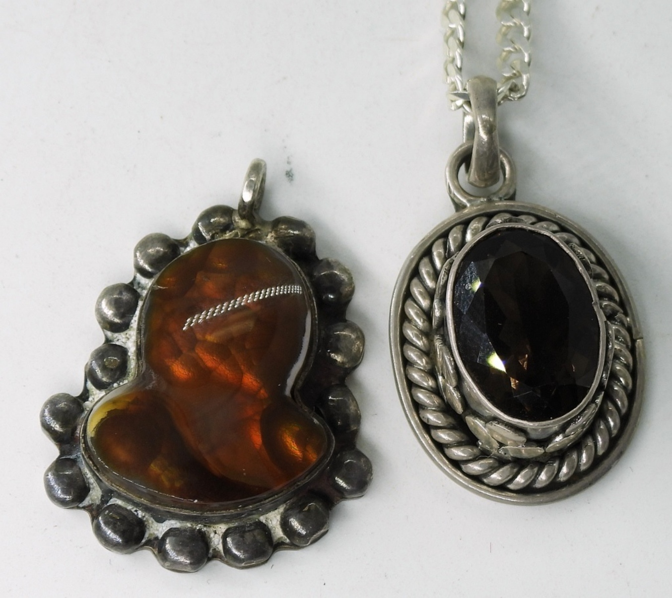 Gorgeous fire agate pendant, 1″. Garnet pendant 1.5″ on a 26″ sterling chain. Other necklace is 18″. (21 dwt)