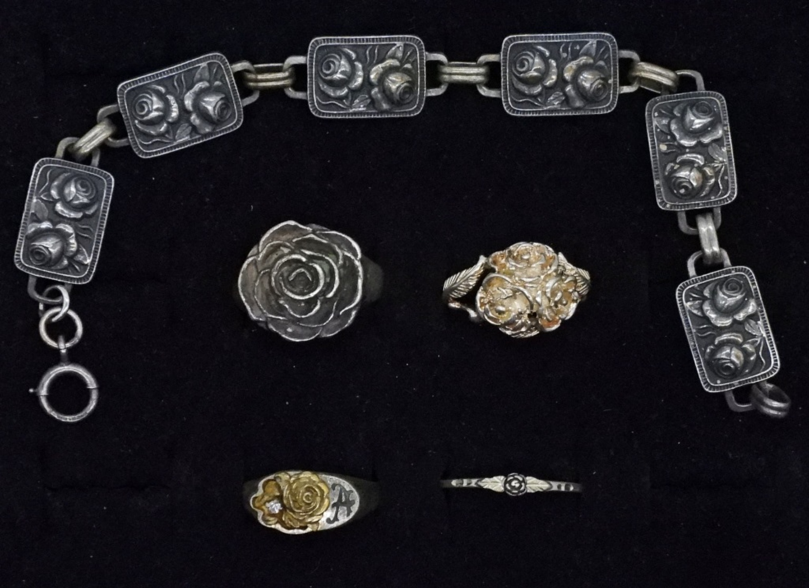 Four sterling rings with roses. One sterling rose detailed bracelet, 7″. Rings are 8, 8.5, 9 (28.2 dwt)