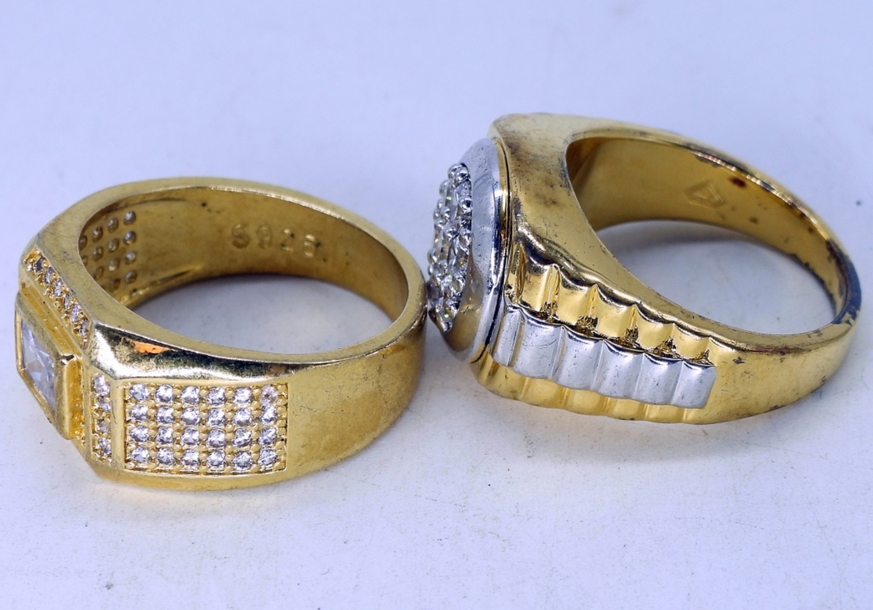 Two sterling men’s rings, gold tone with simulated diamonds. Sizes 10.5 & 11.5. (14.4 dwt)
