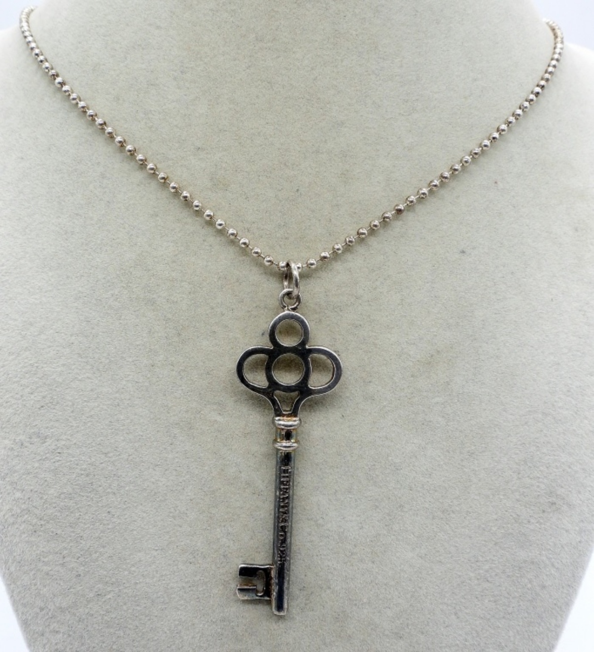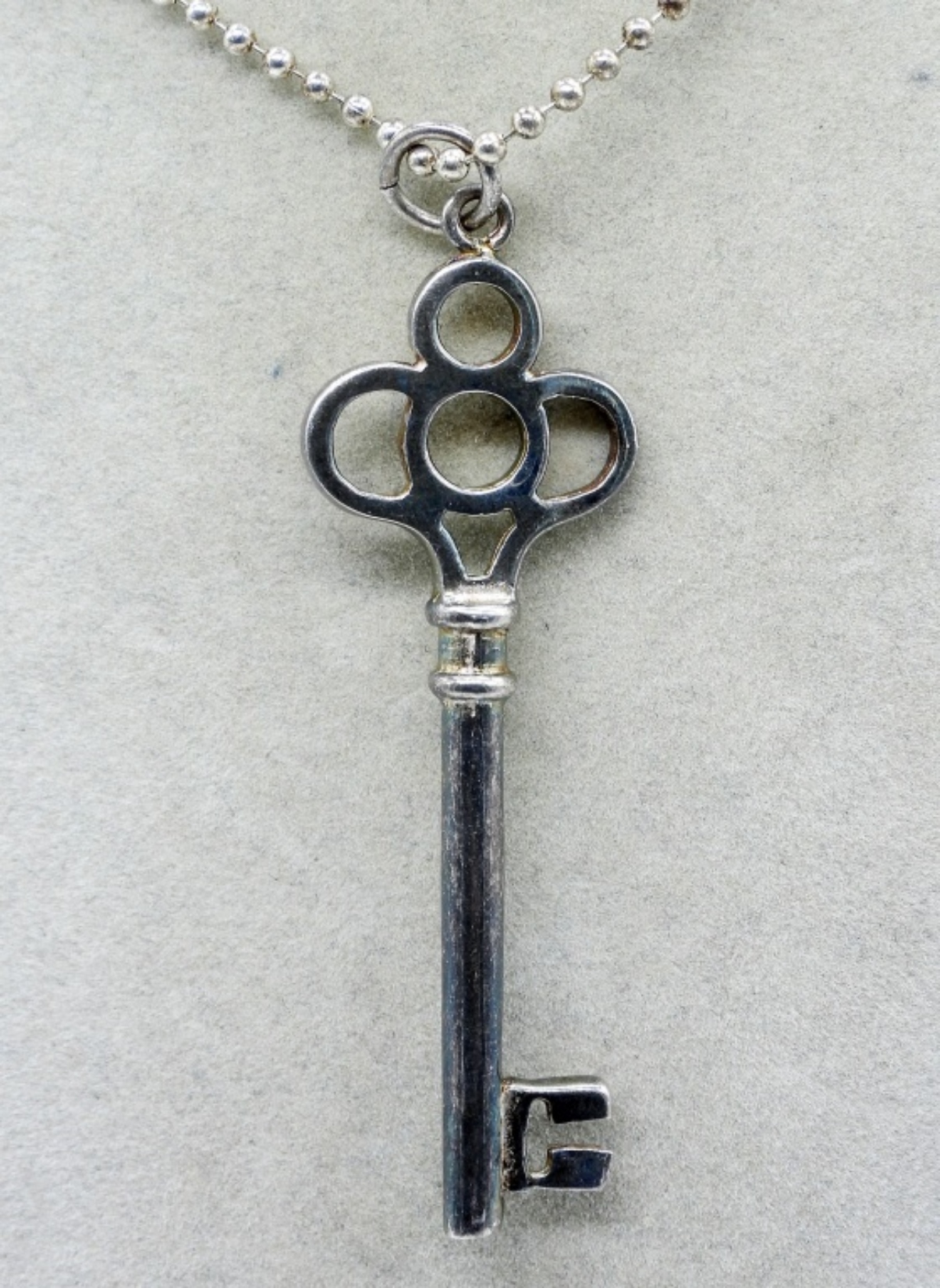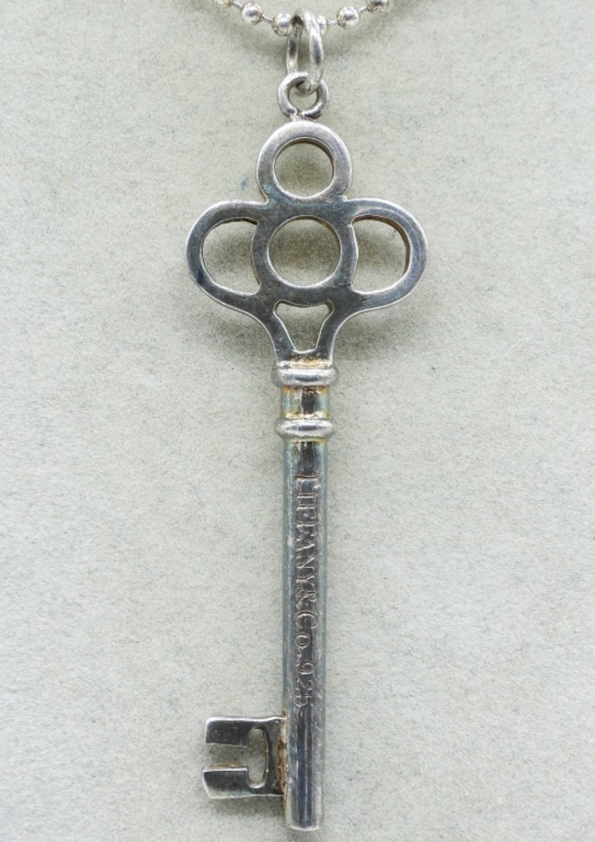 Tiffany & Co skeleton key 925 pendant, 2 3/4″. On a 30″ chain (not tiffany). (8.5 dwt)