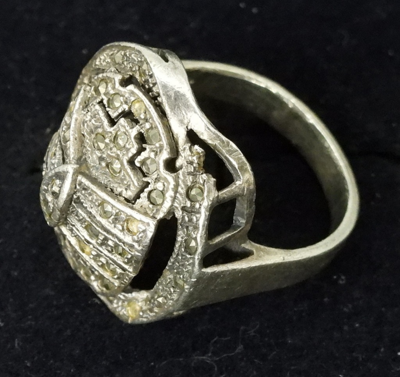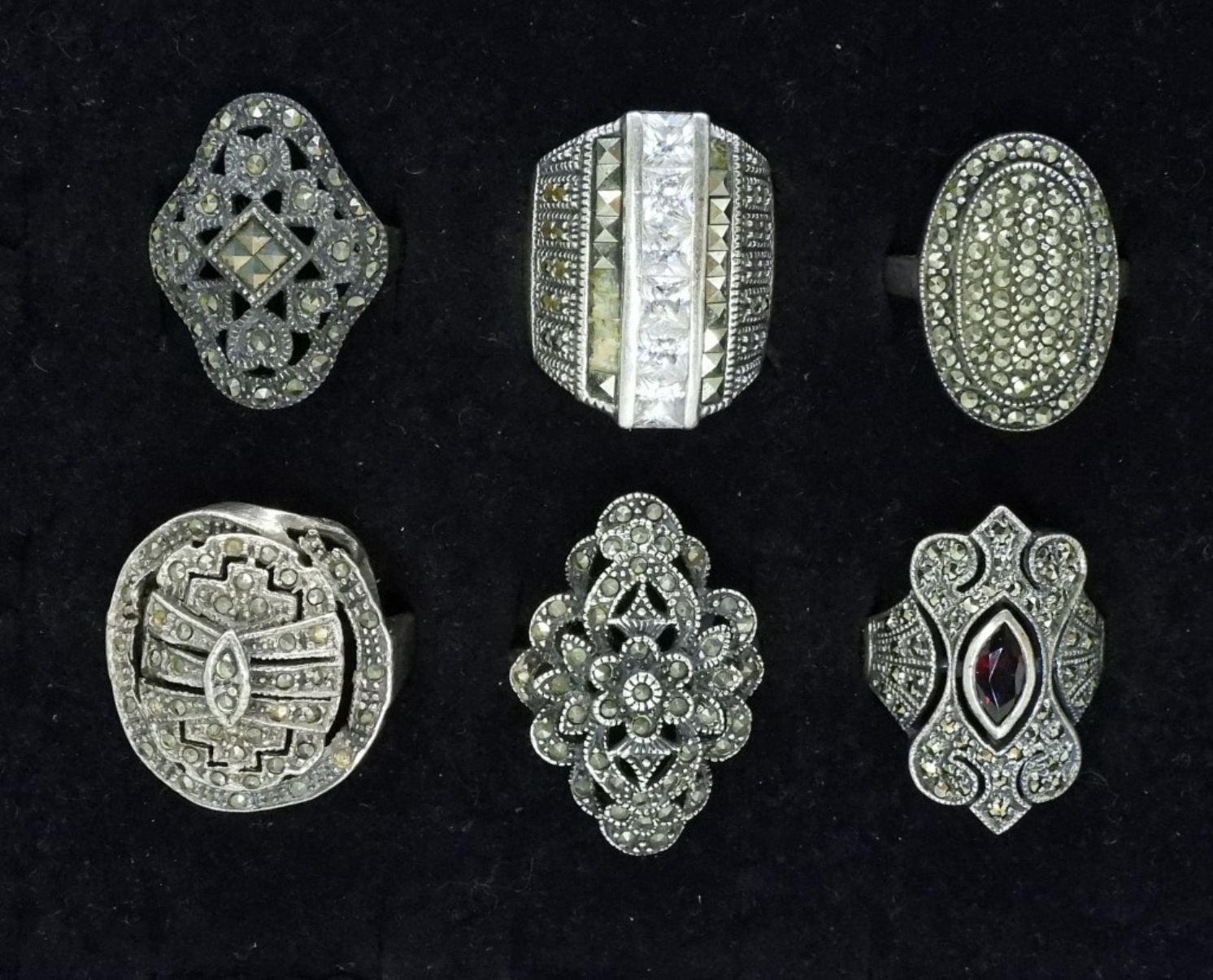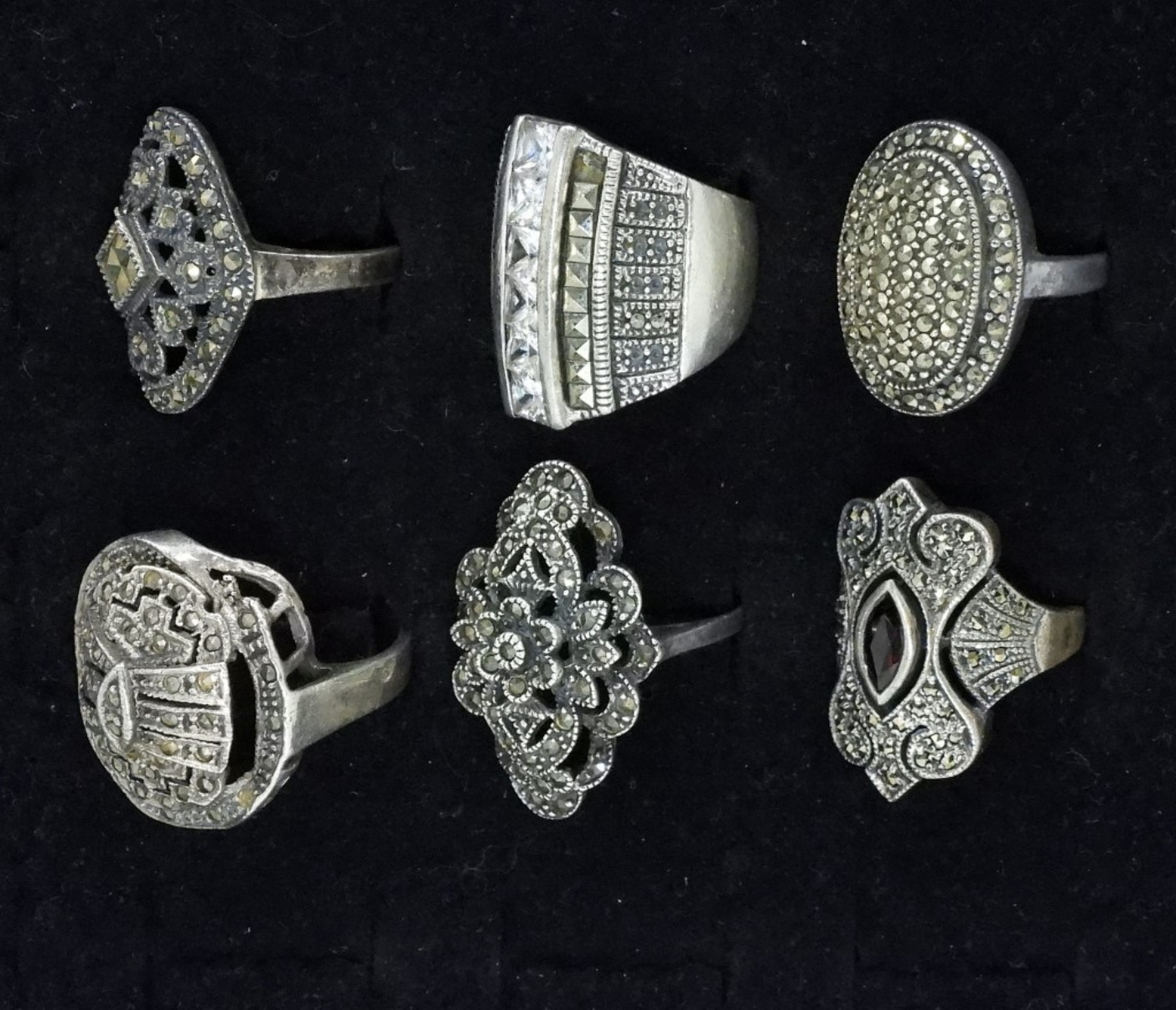Six sterling marcasite fashion rings. Sizes 6-9 (29 dwt)