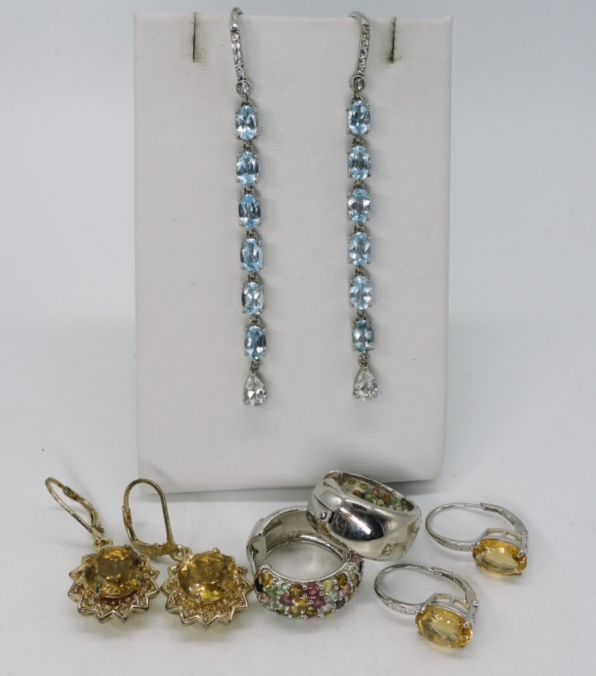 Four pair of sterling earrings, pierced. Blue topaz, citrine and more. (18.2 dwt)