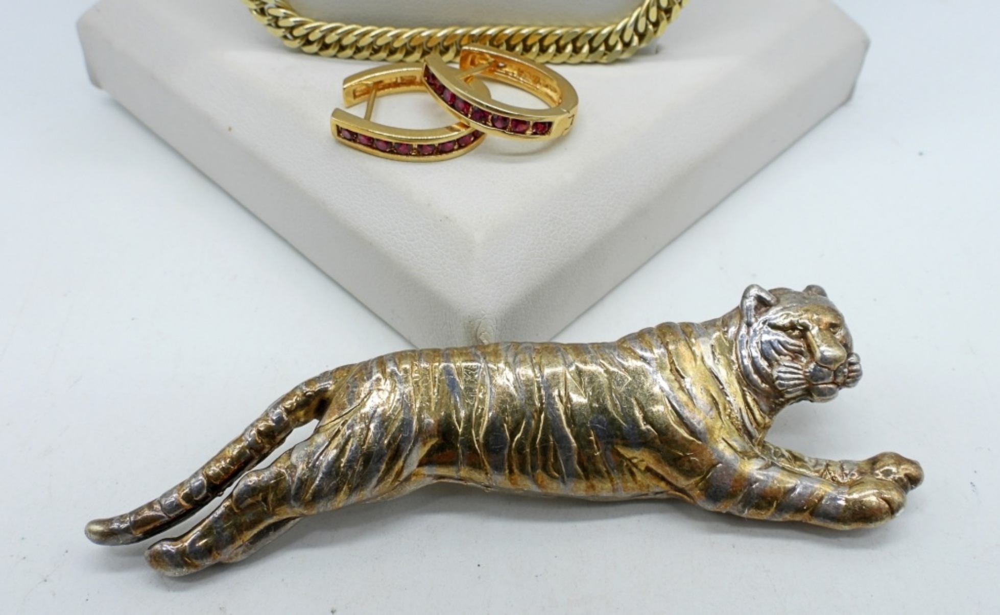 Tiger Brooch, Sterling with gold tones, 3.5″ Wide. Gold Tone Sterling Chain, 24″. Gold Tone Sterling Pierced Earrings with faux rubies. (35 DWT)