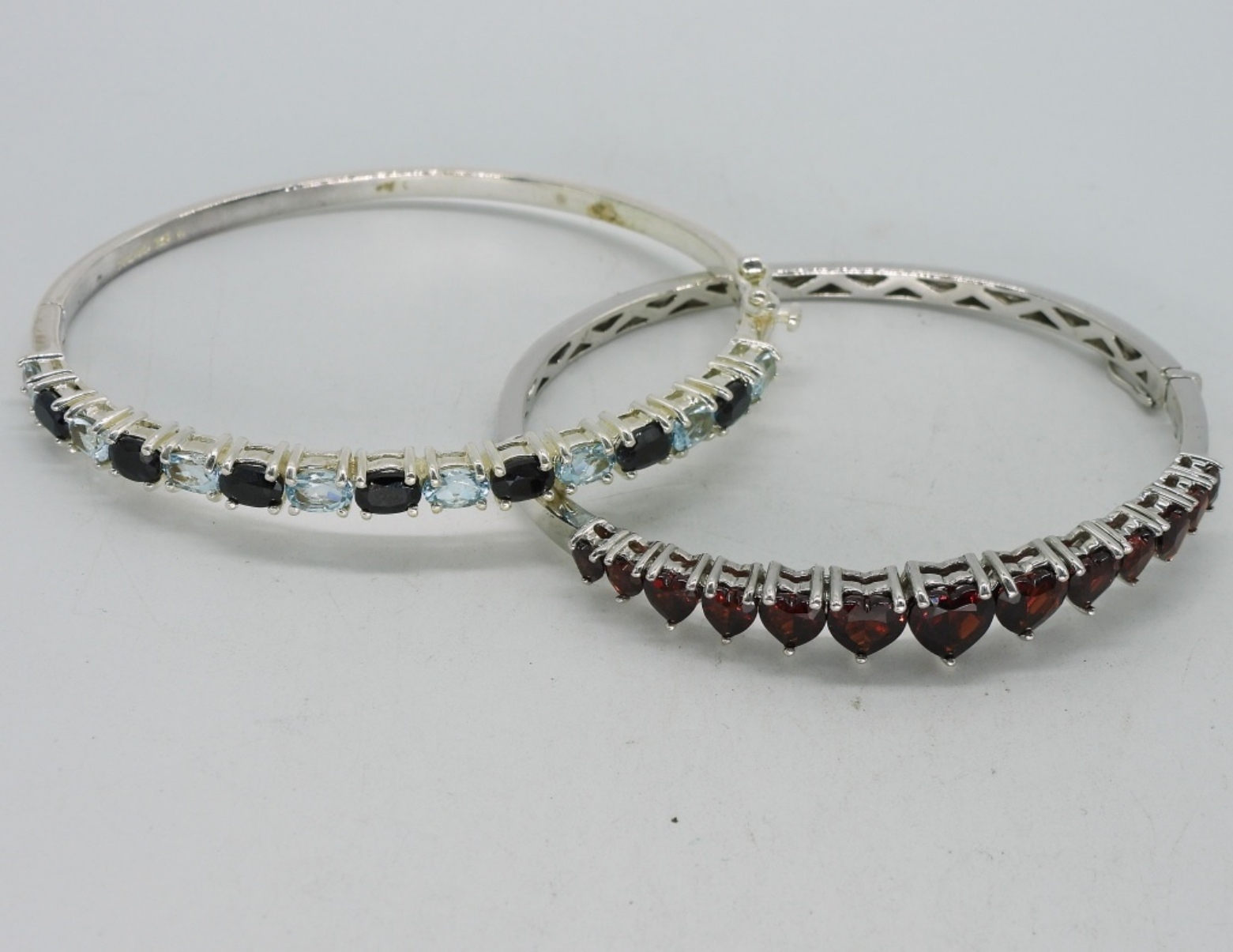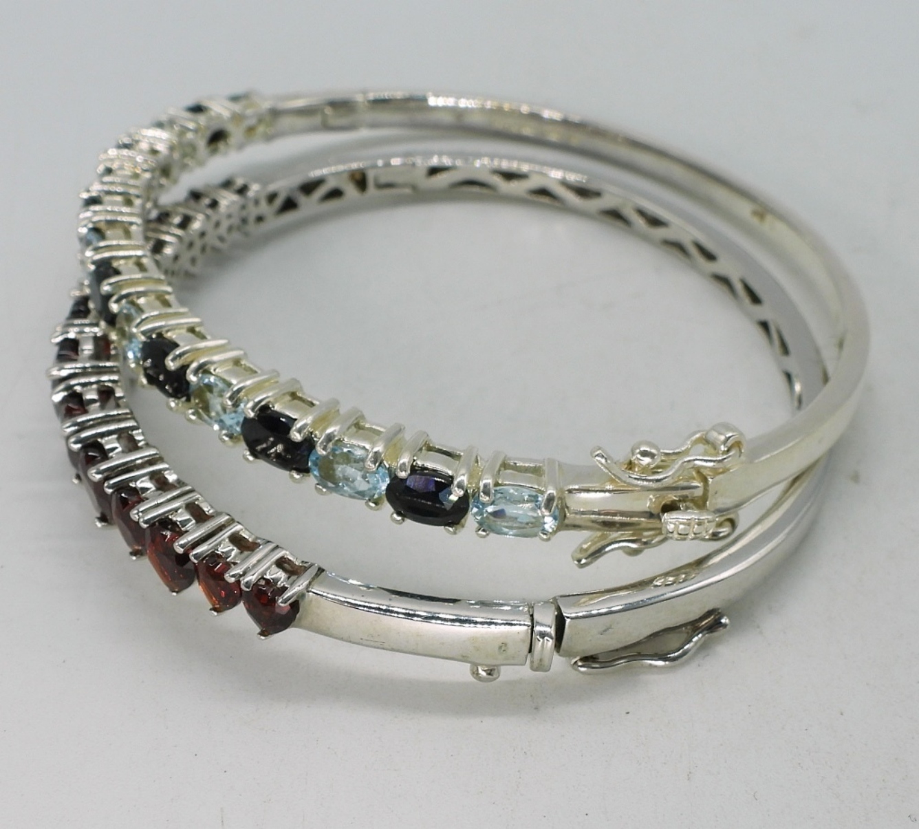 Two sterling hinged bangle bracelets. Garnet, blue topaz & simulated sapphire. 8″. (23 dwt)