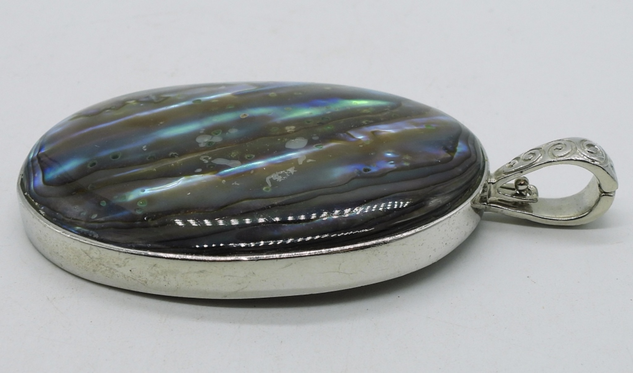 Very large, sterling pendant with abalone shell center. 3″ long, 2″ wide. (25 dwt)