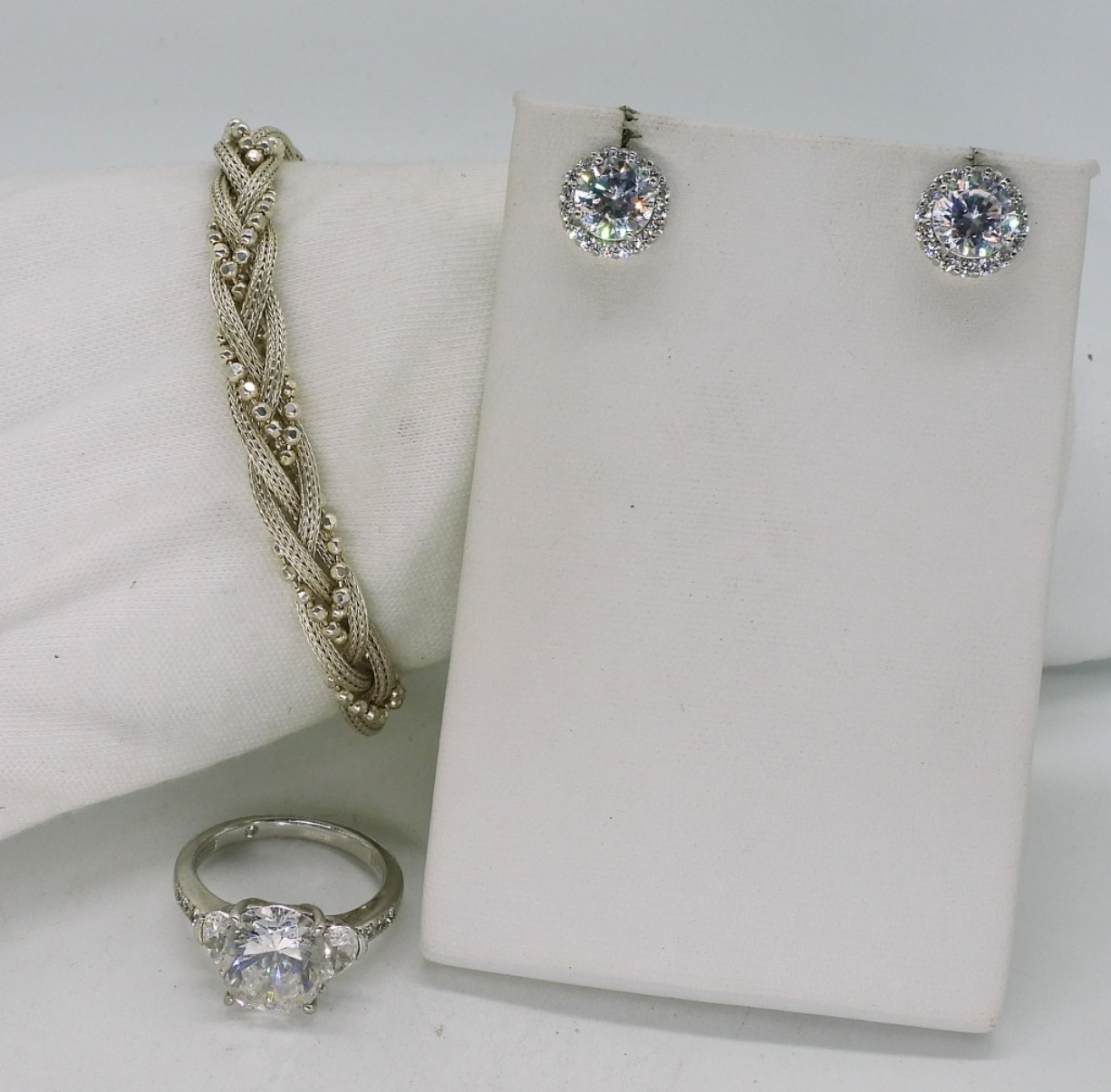 Sterling simulated diamond ring, size 9. Matching pierced earrings. Bracelet is 8″. (17 dwt)