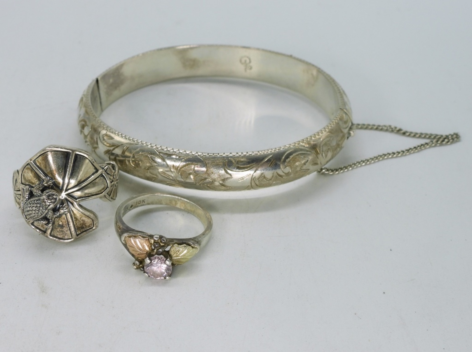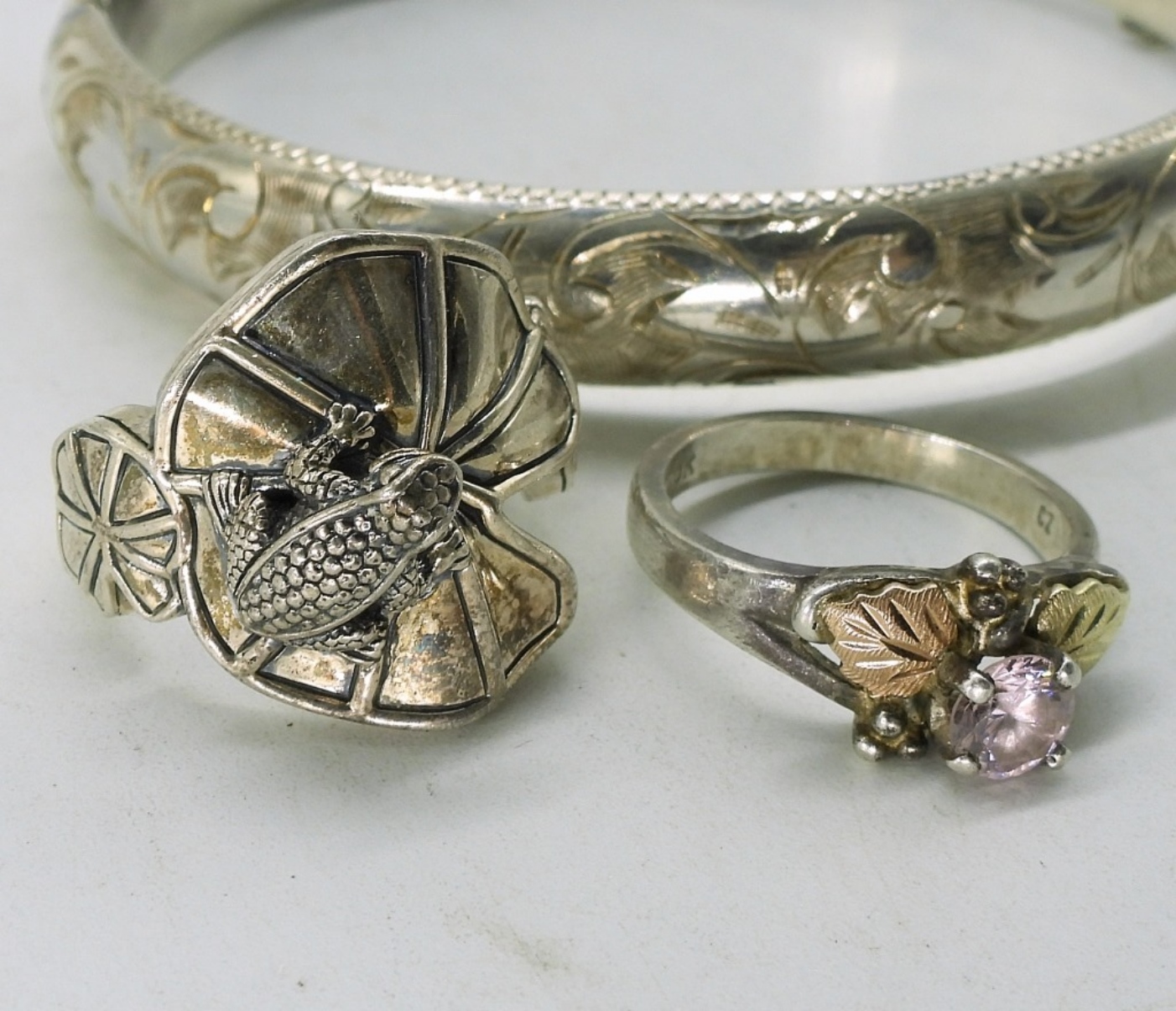 KC Studio 2011, Barry Kieselstein Frog on Lilypad ring, size 6. Hinged etched sterling bracelet and pink gemstone 925 / 10k ring, size 6. (17.9 dwt)