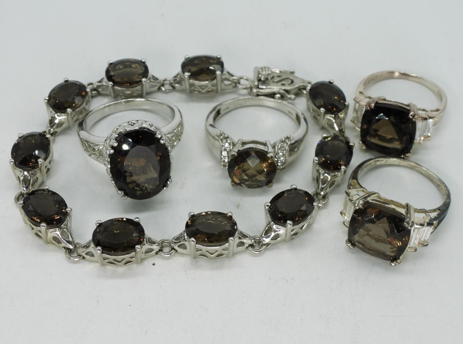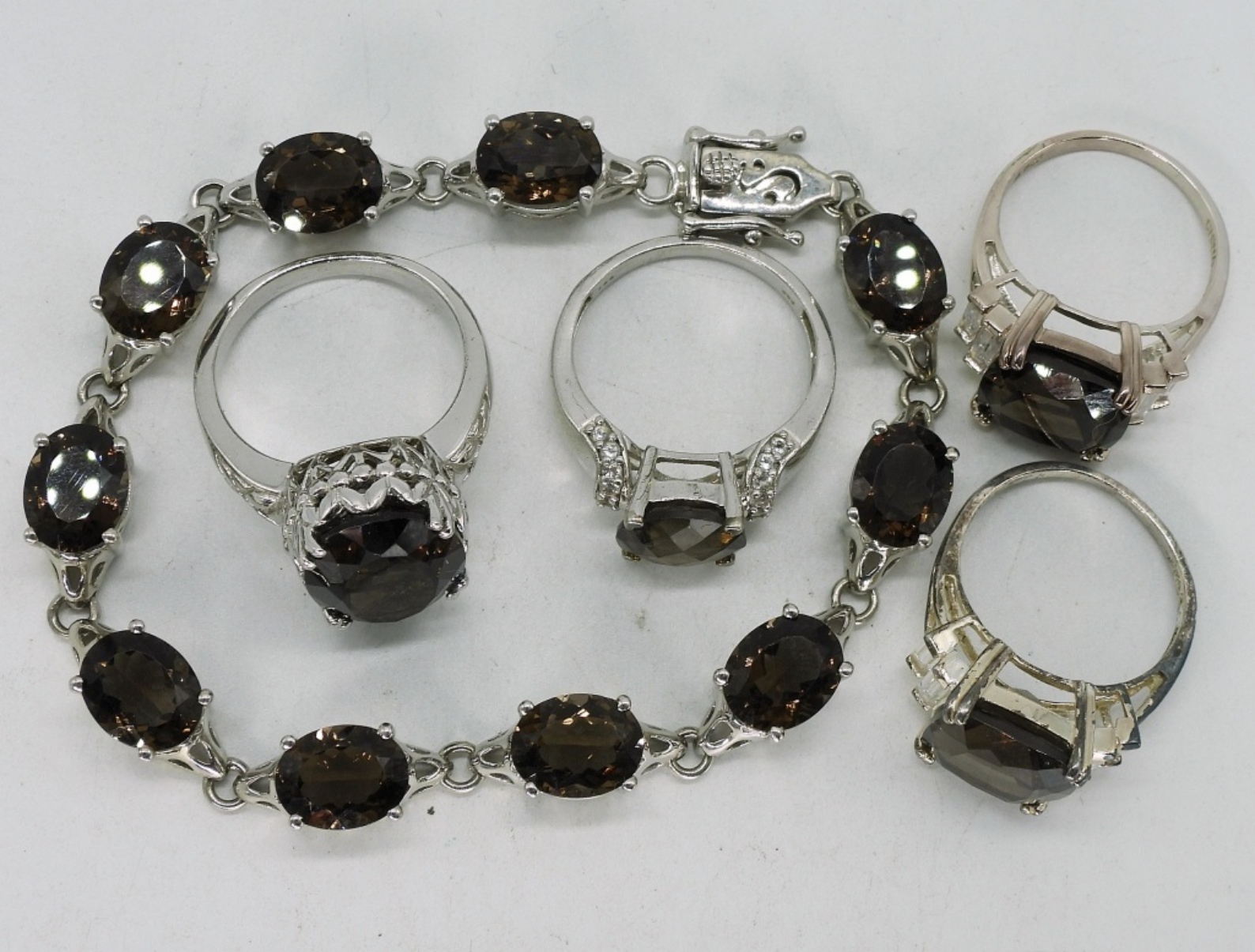 Four sterling rings with smokey quartz gemstones, sizes 8 & 9. Matching bracelet, 8″. (23 dwt)