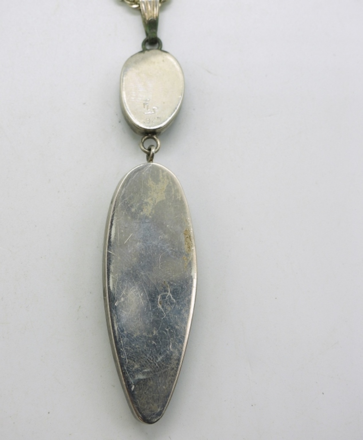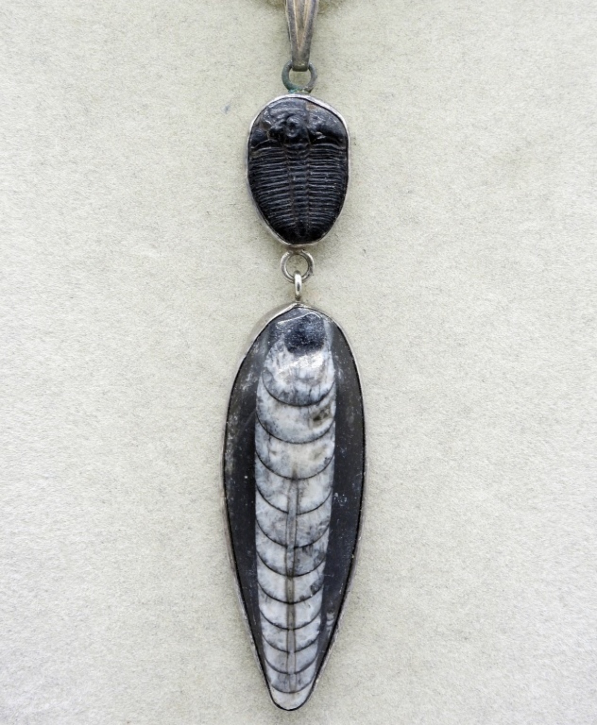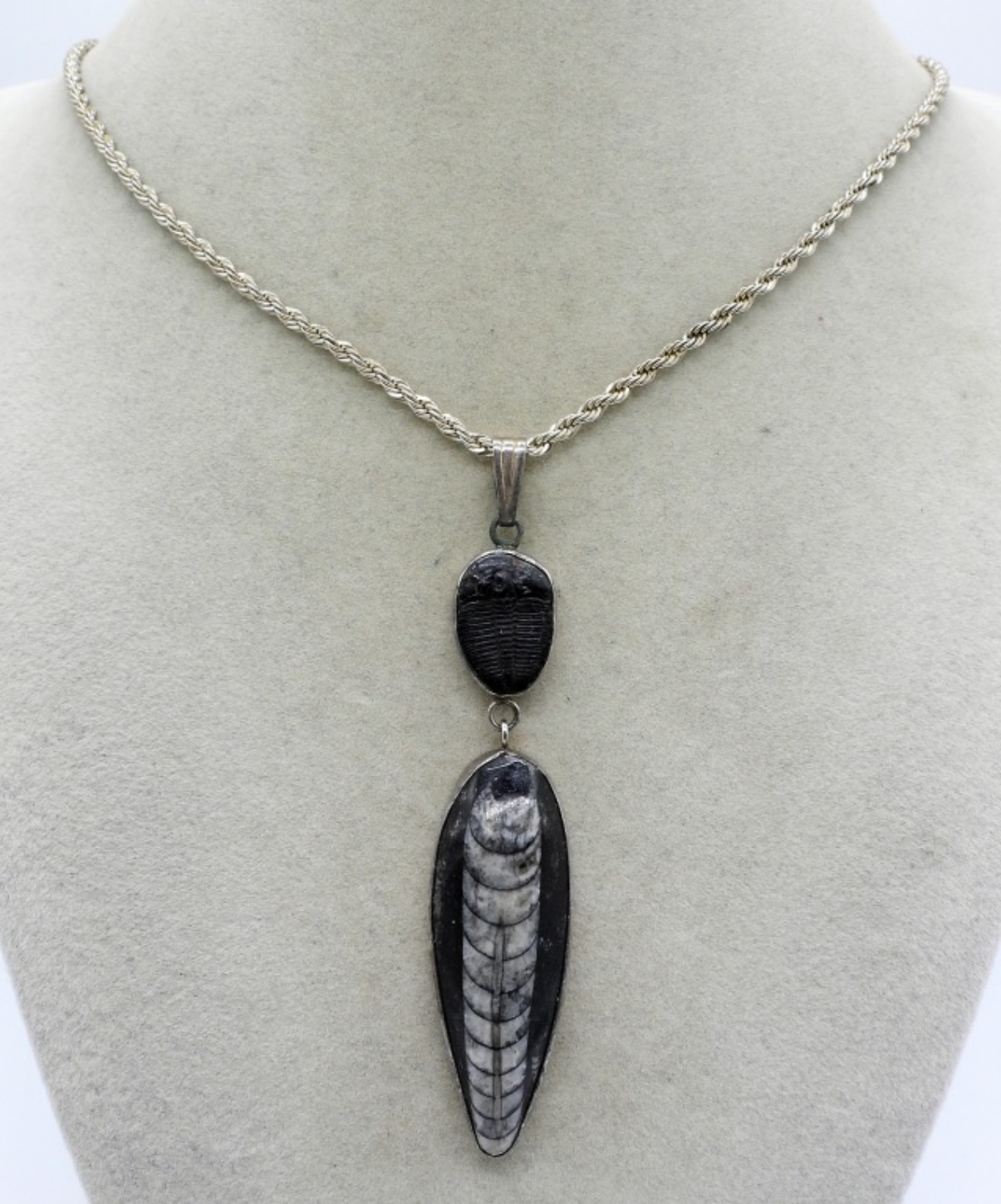 Trilobite & Orthoceras Fossil sterling necklace. Pendant is 3.5″, sterling chain is 22″ (14.7 dwt)