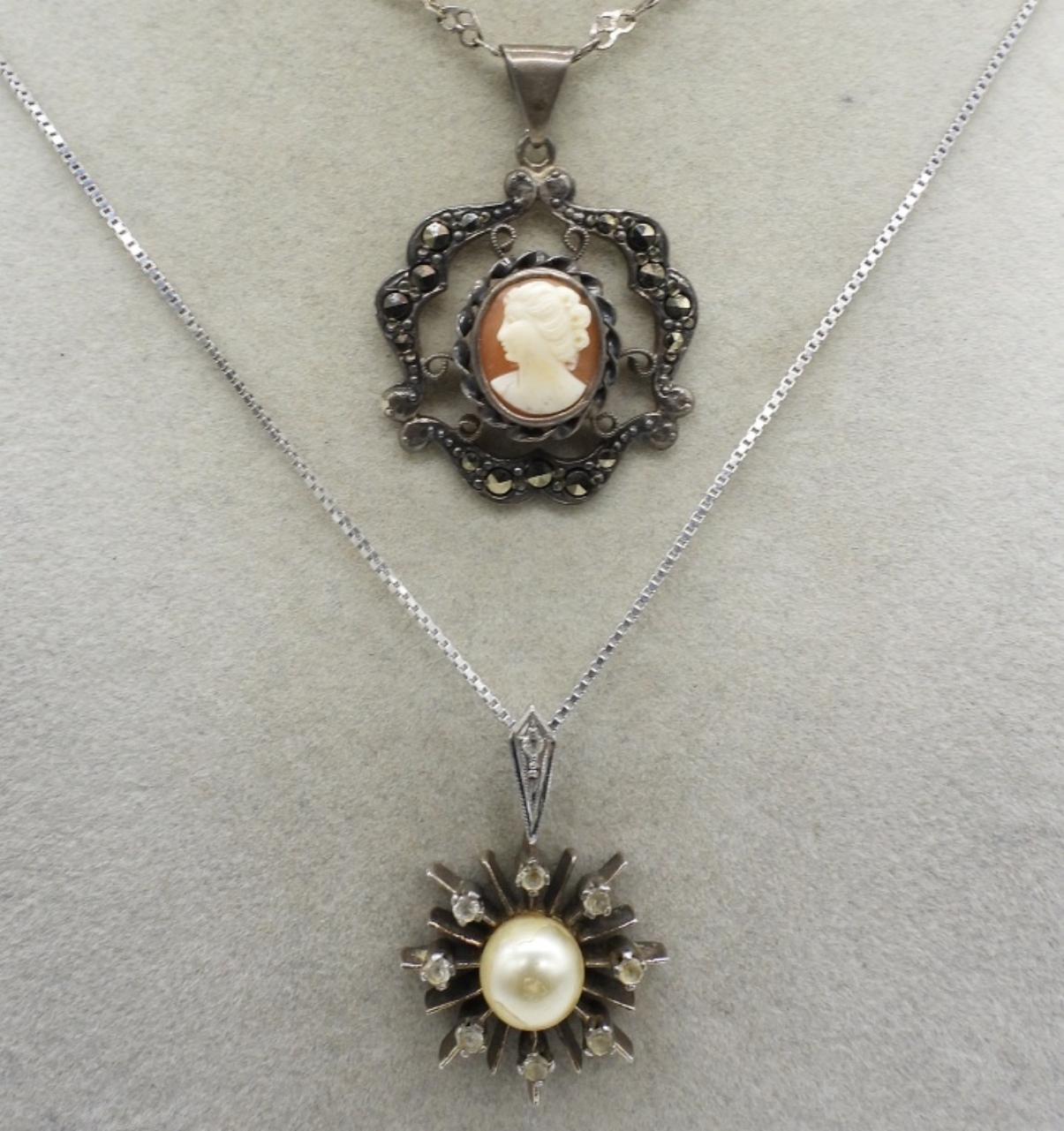 Vintage Necklaces, Cameo & Pearl. Sterling chains are 18″ & 24″. Two simulated diamond bracelets, 7″ & 7.5″. (23.5 dwt)
