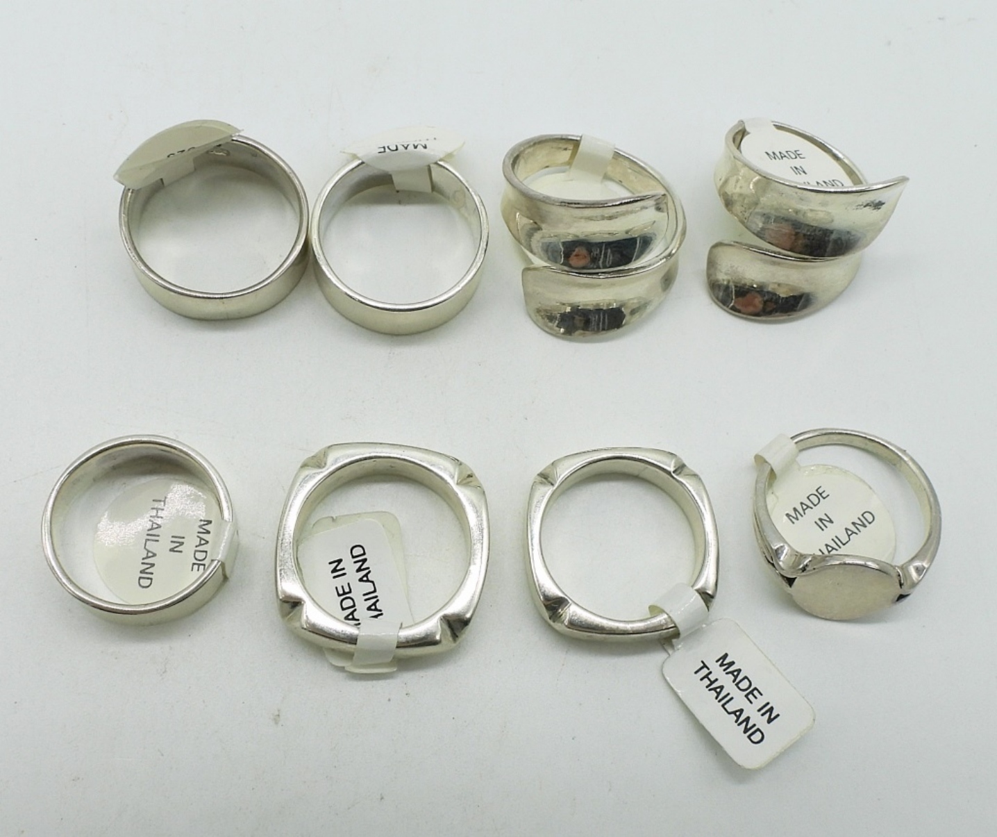 Eight new with tag, fashion sterling rings. Sizes 6-8. (30 dwt)
