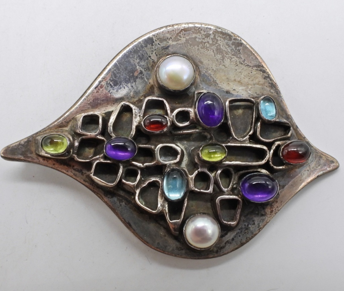 Large Sterling Brooch / Pendant. 3″ x 2″. Amethyst, Pearl, Garnet & Peridot gemstones. (20 dwt)