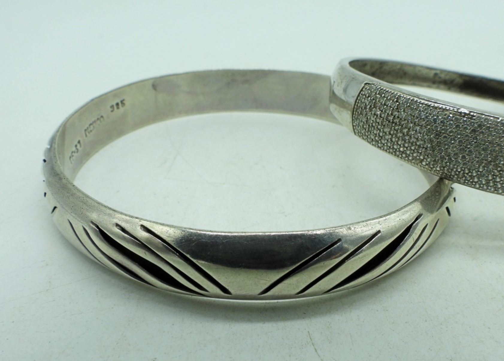 Taxco Sterling Bangle Bracelet marked “TF-37 Mexico 925”, 8 “. Simulated diamond encrusted (missing some stones) hinged bracelet and an etched sterling bangle. (26.4 dwt)