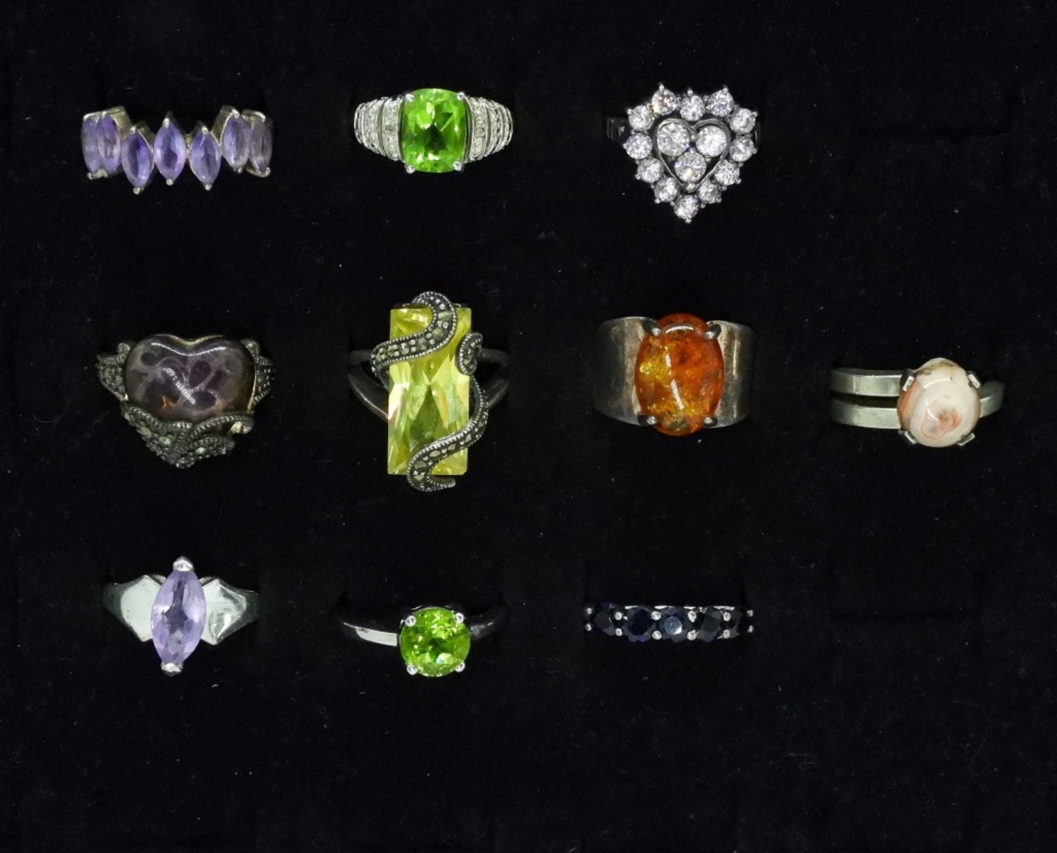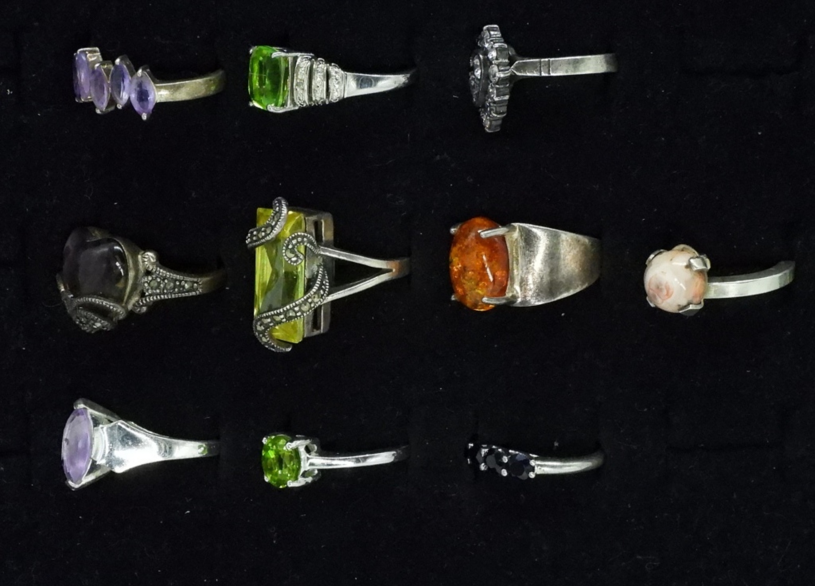 Ten sterling rings, sizes 6-8. Amber, Peridot, Onyx & More. (30 dwt)