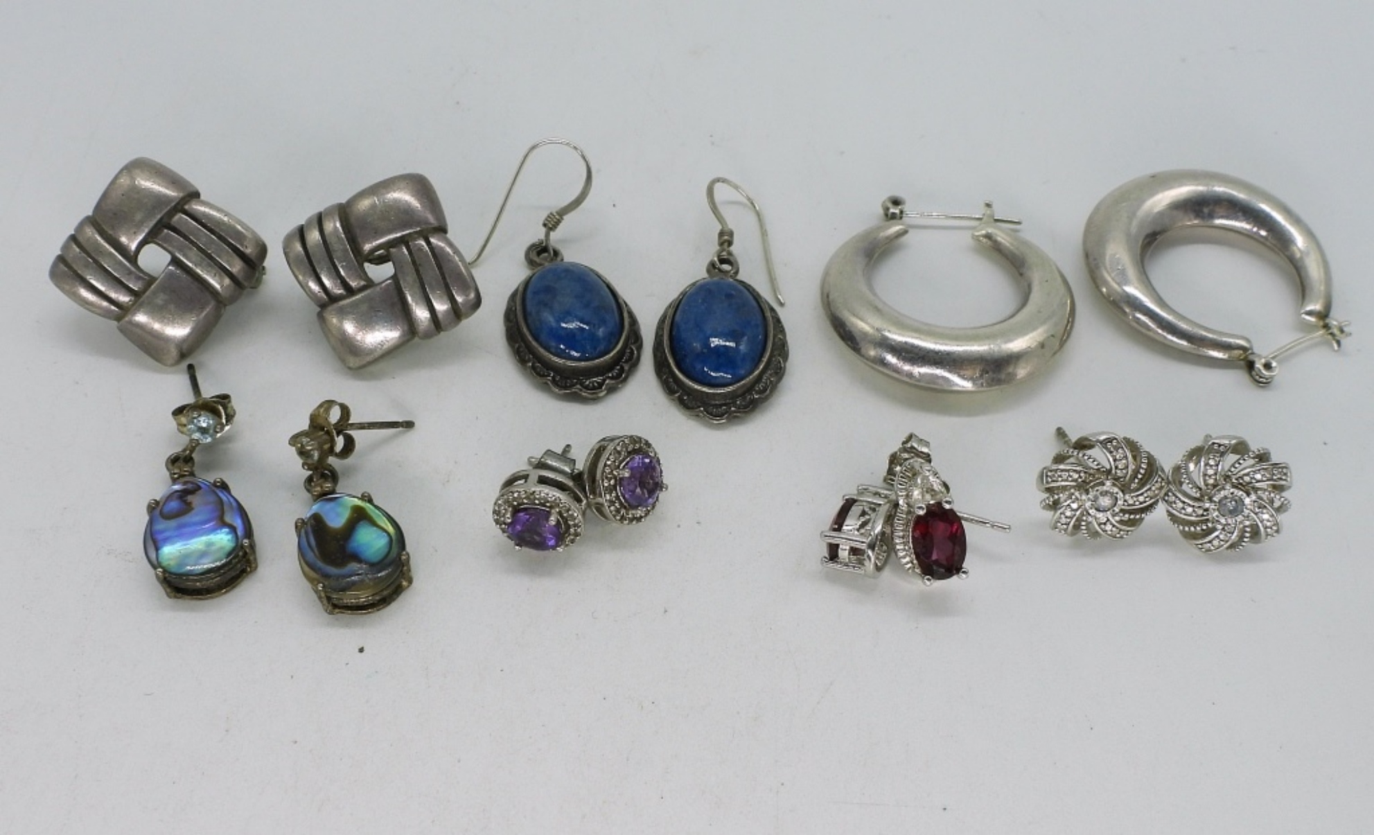 Seven pair of sterling pierced earrings. Abalone, Amethyst, Garnet & More. (22 dwt)