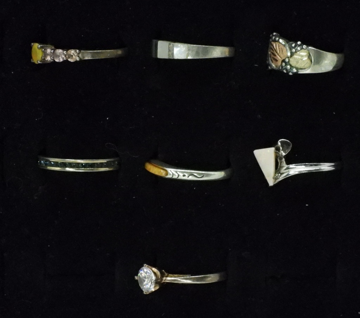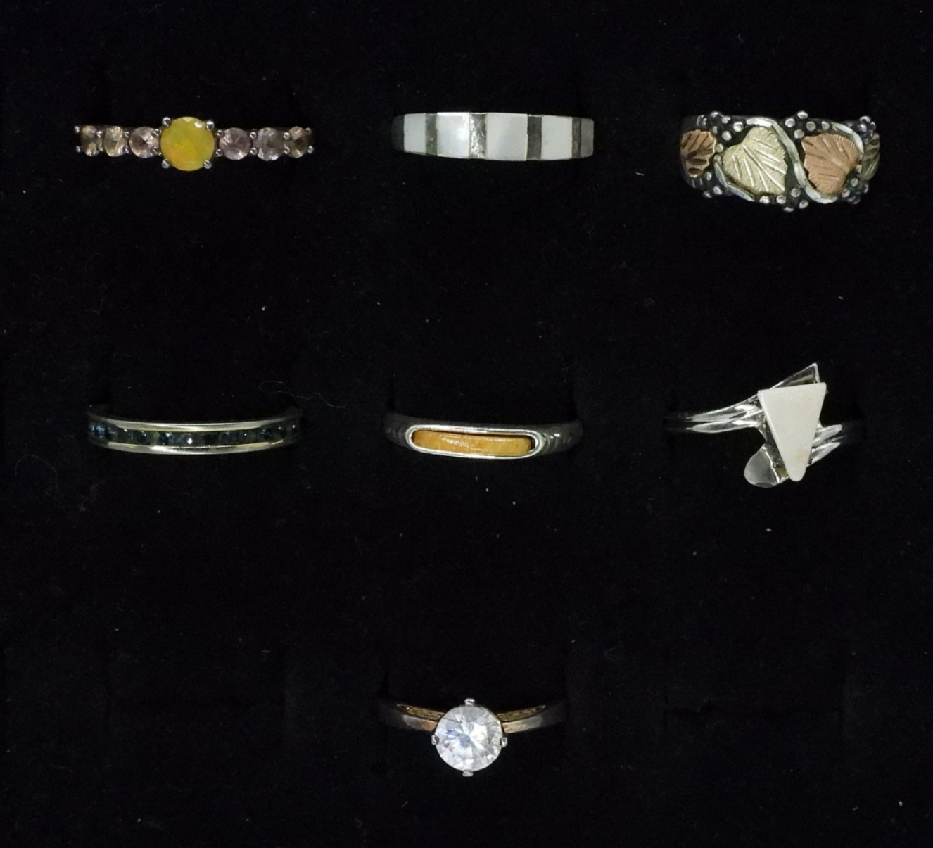 Seven sterling gemstone rings, sizes 6-10. Mother of Pearl, Opal and other. (13.2 dwt)