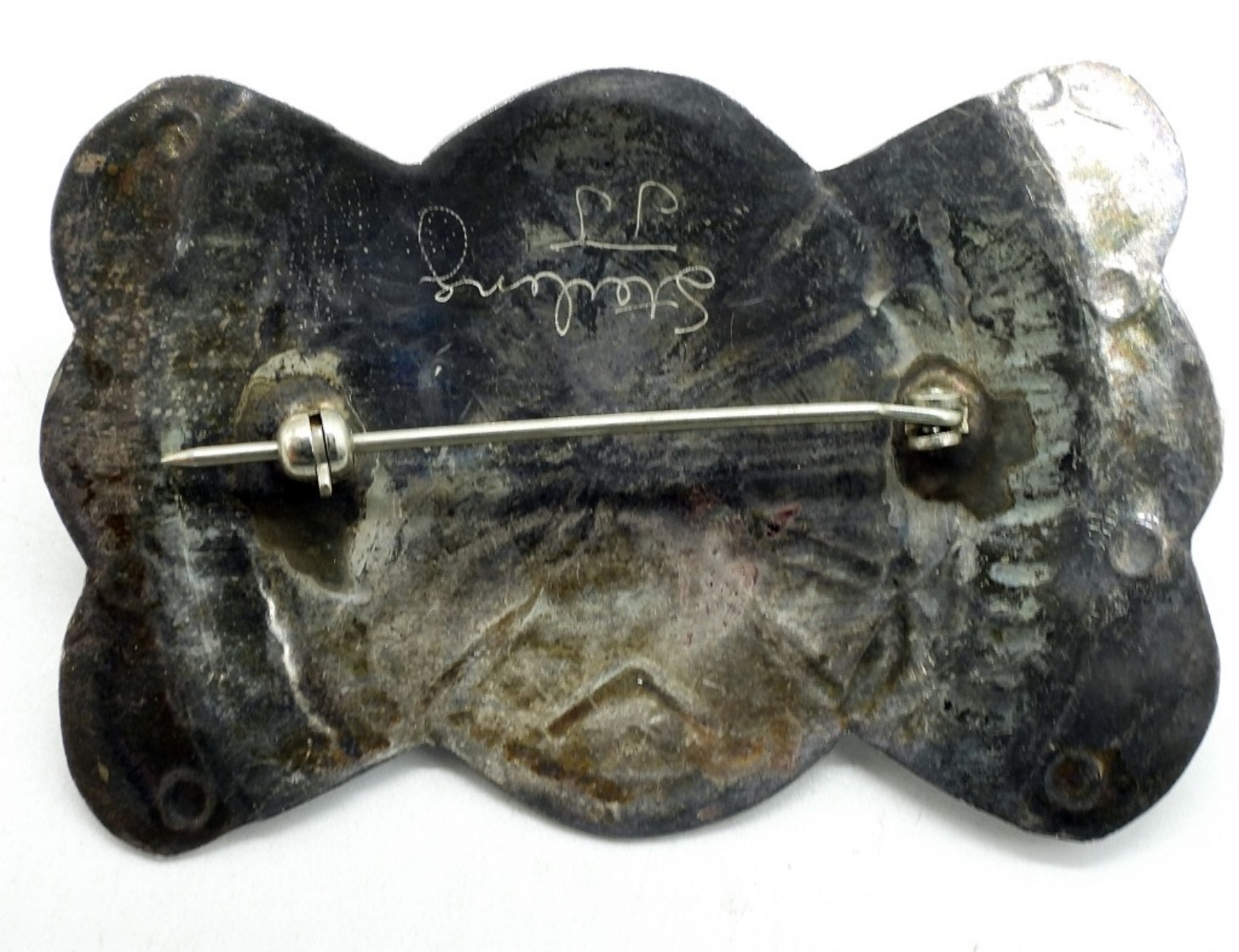 Three sterling rings with turquoise, sizes 4, 4.5, 6.7. Pin is 2.5″ wide. One pair of liquid sterling pierced earrings, 2″. (17.6 dwt)
