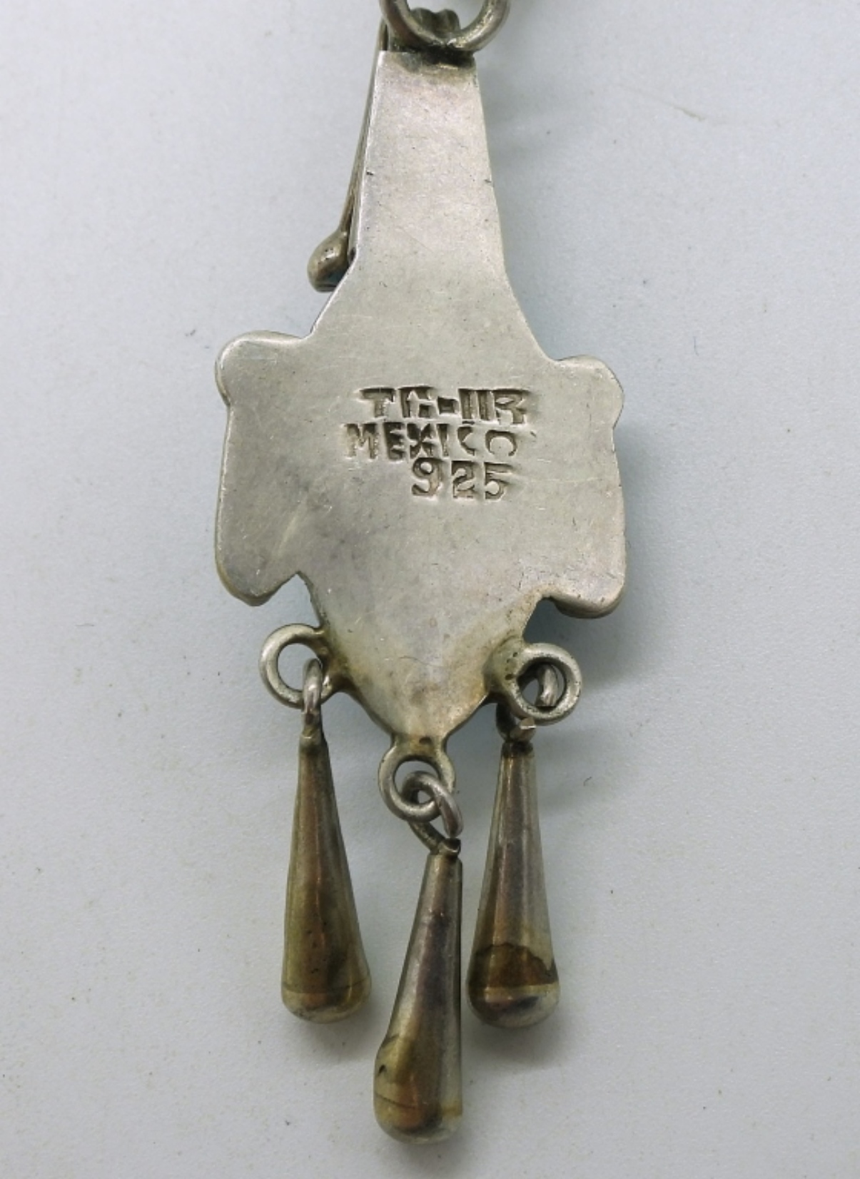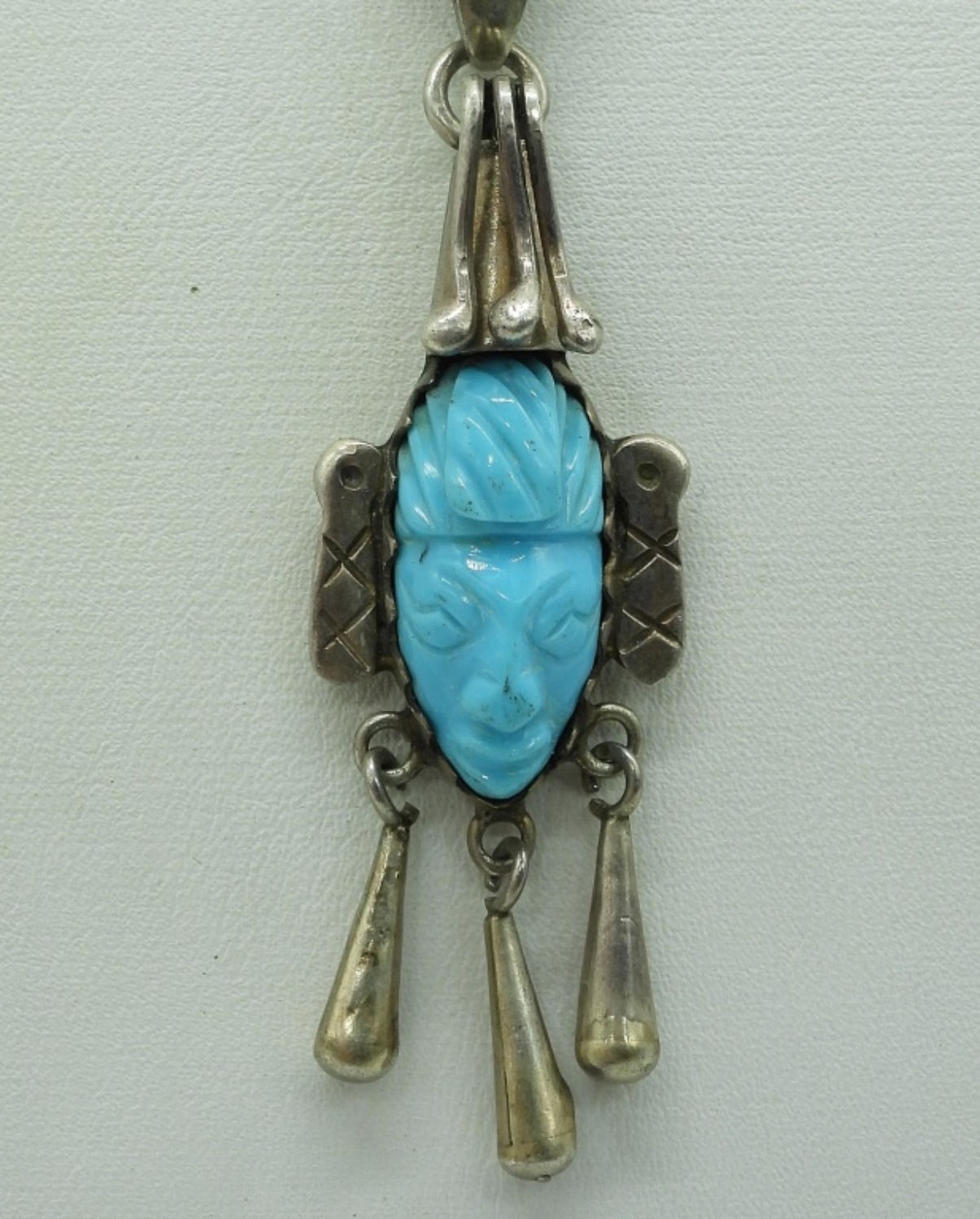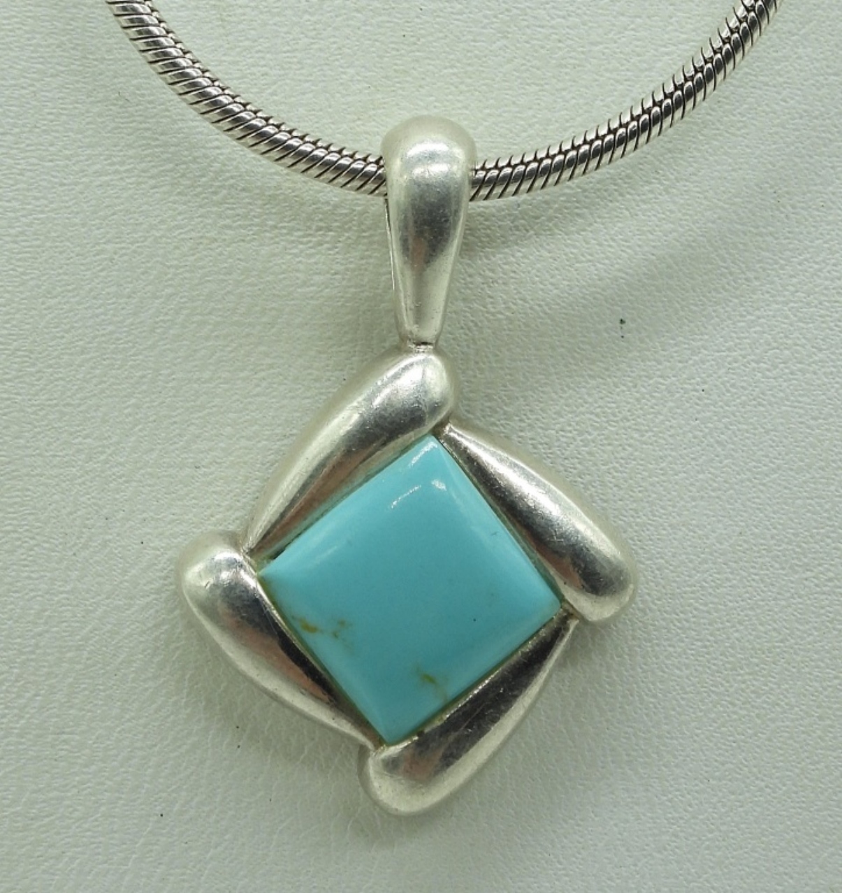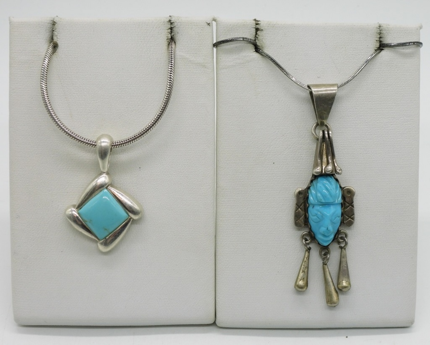 Taxco Mexico sterling turquoise face pendant, 2.5″on a sterling 19″ chain. Marked “tc-115”. Other sterling turquoise pendant, 1.5″ on a sterling 24″ chain. (19.7 dwt)