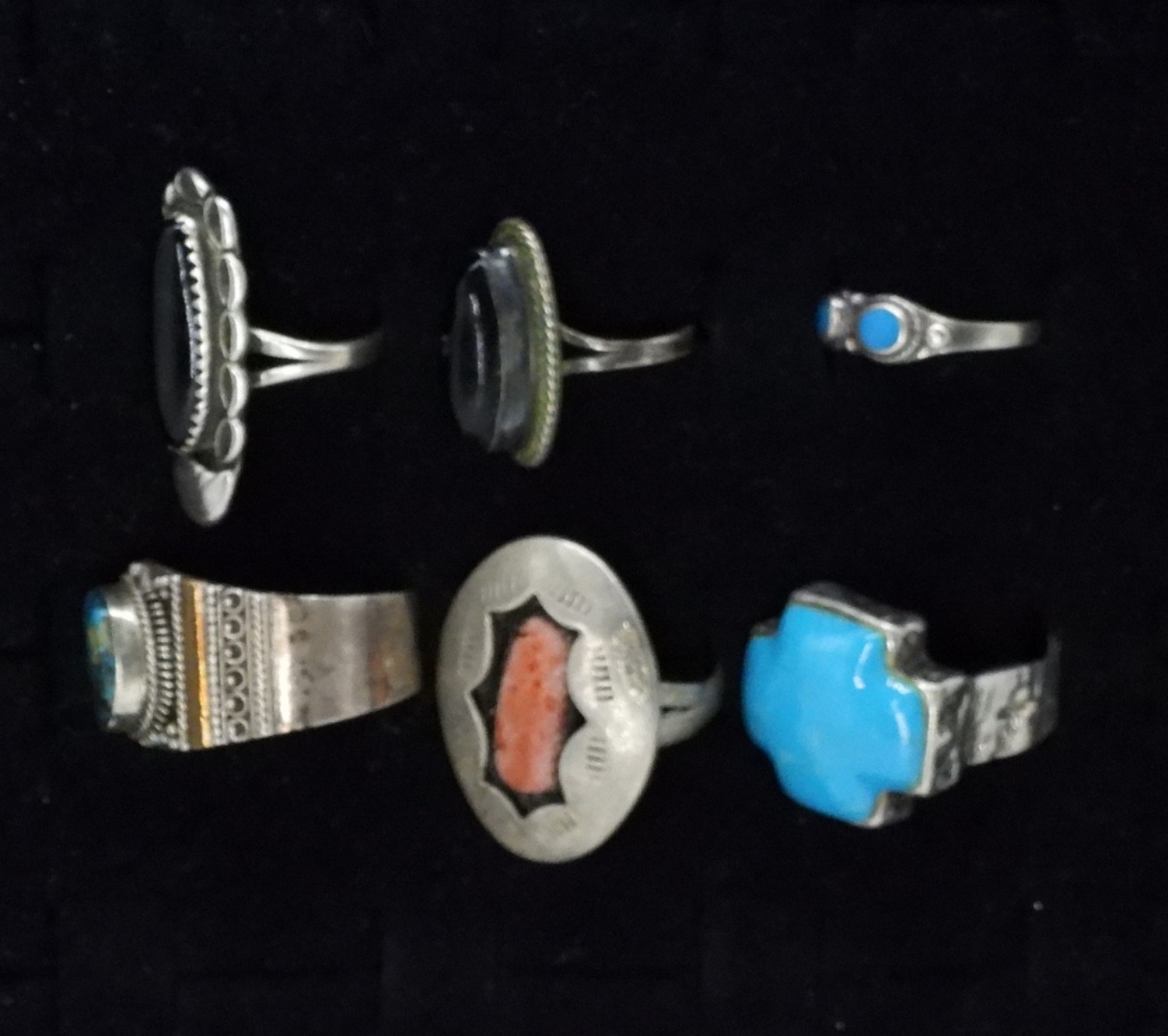 Six sterling rings with turquoise gemstones, black onyx and red coral. Sizes 4-14 (24.5 dwt)
