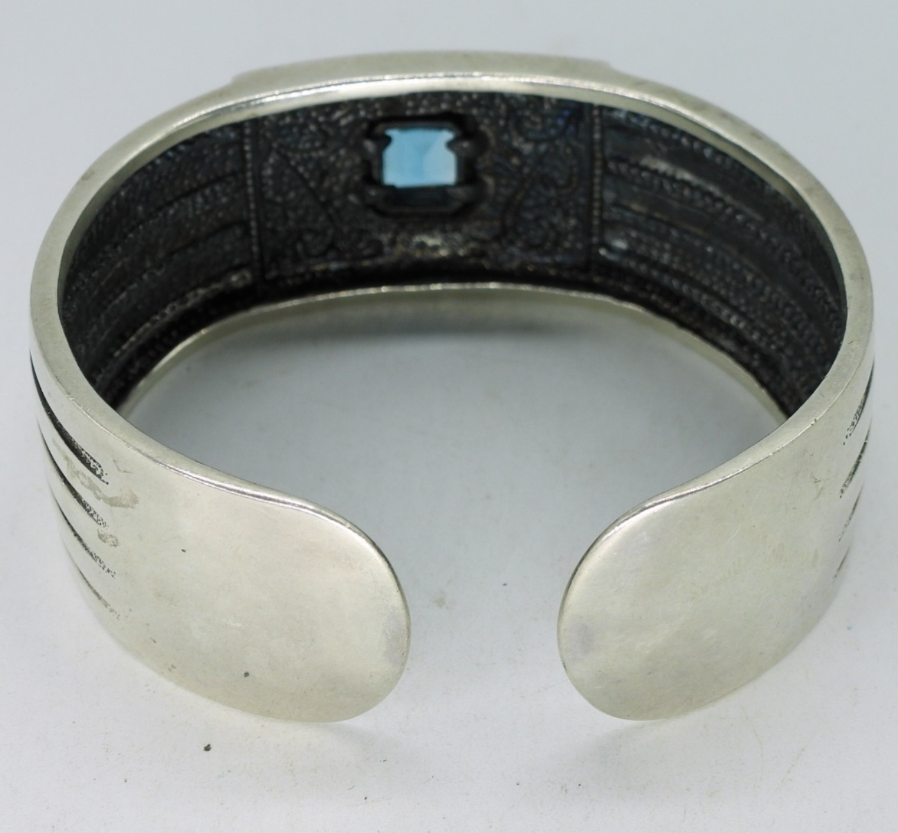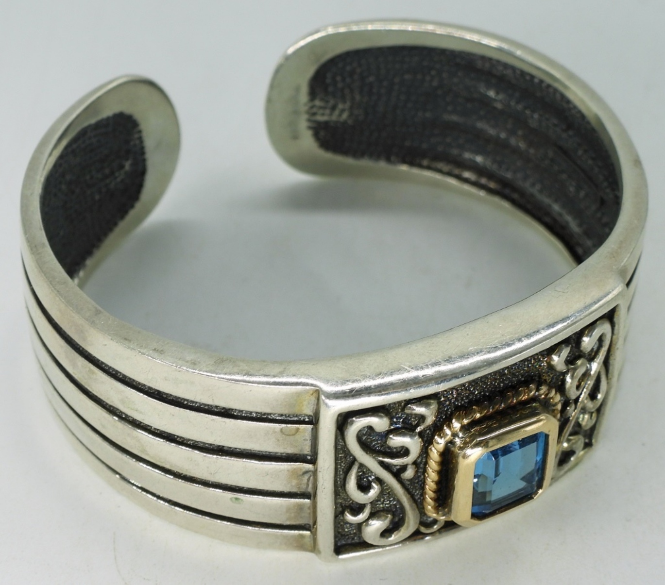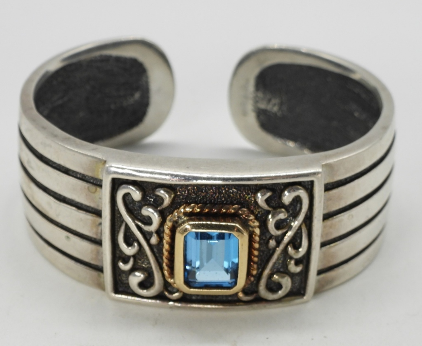 Sterling blue topaz cuff bracelet with gold tone accents. 7″. (43.6 dwt)