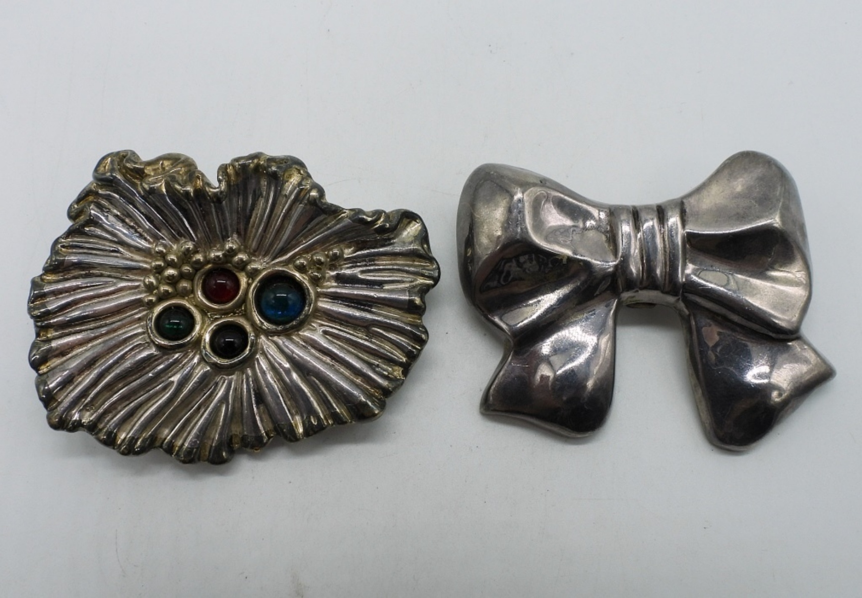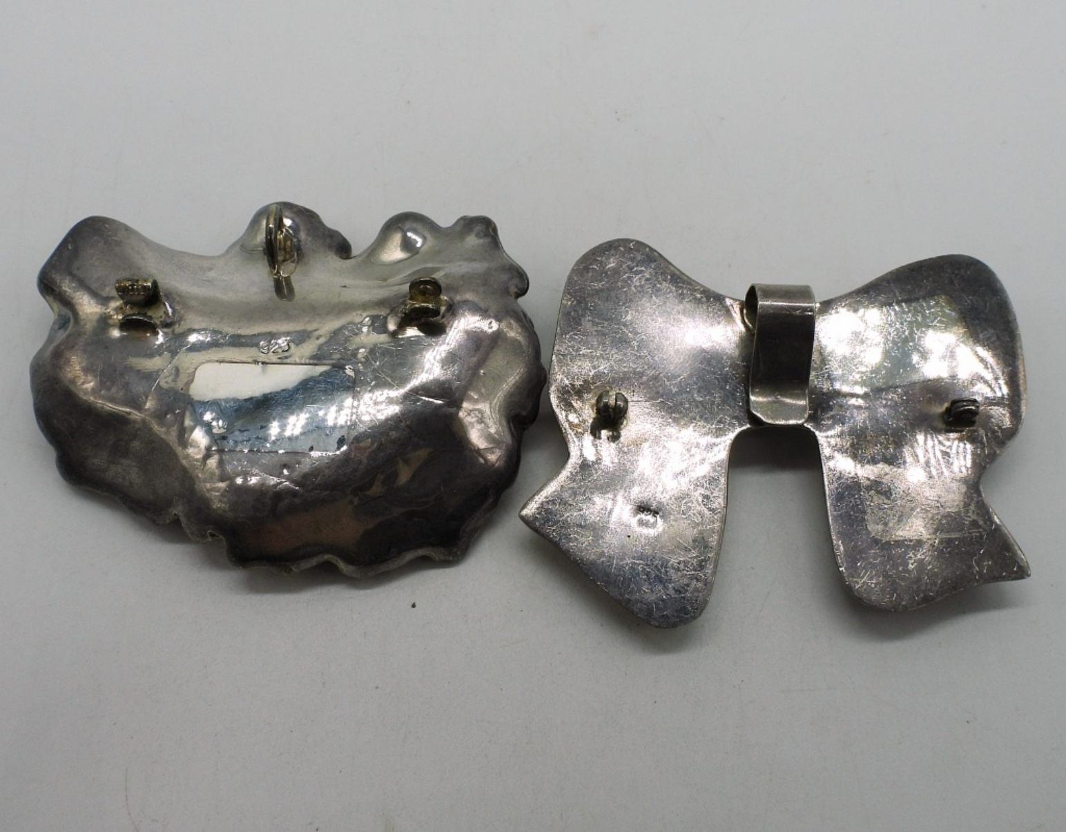 2 large puffed sterling pendants (pins as well but the pin portion on both is broken). Both 2.5″ x 2″. (30 dwt)