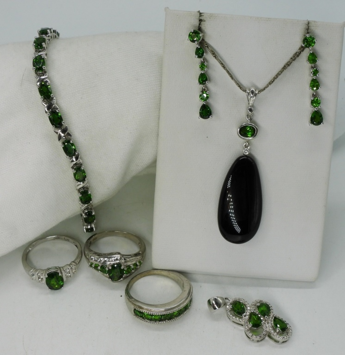 7 piece sterling set. Gemstones are likely either Chrome Diopside or Tourmaline. Three rings, size 8. Two pendants, one 18″ chain. Pierced earrings, 1″. Bracelet 7.5″. (23 dwt)