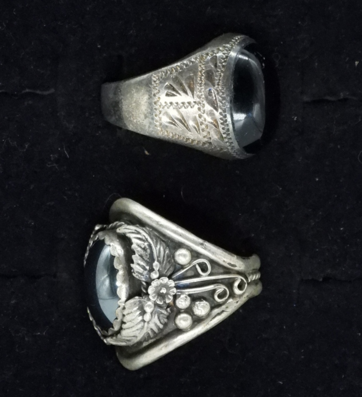 Two sterling large rings. One with black onyx and one with hematite. Sizes 10 & 12. (21.5 dwt)