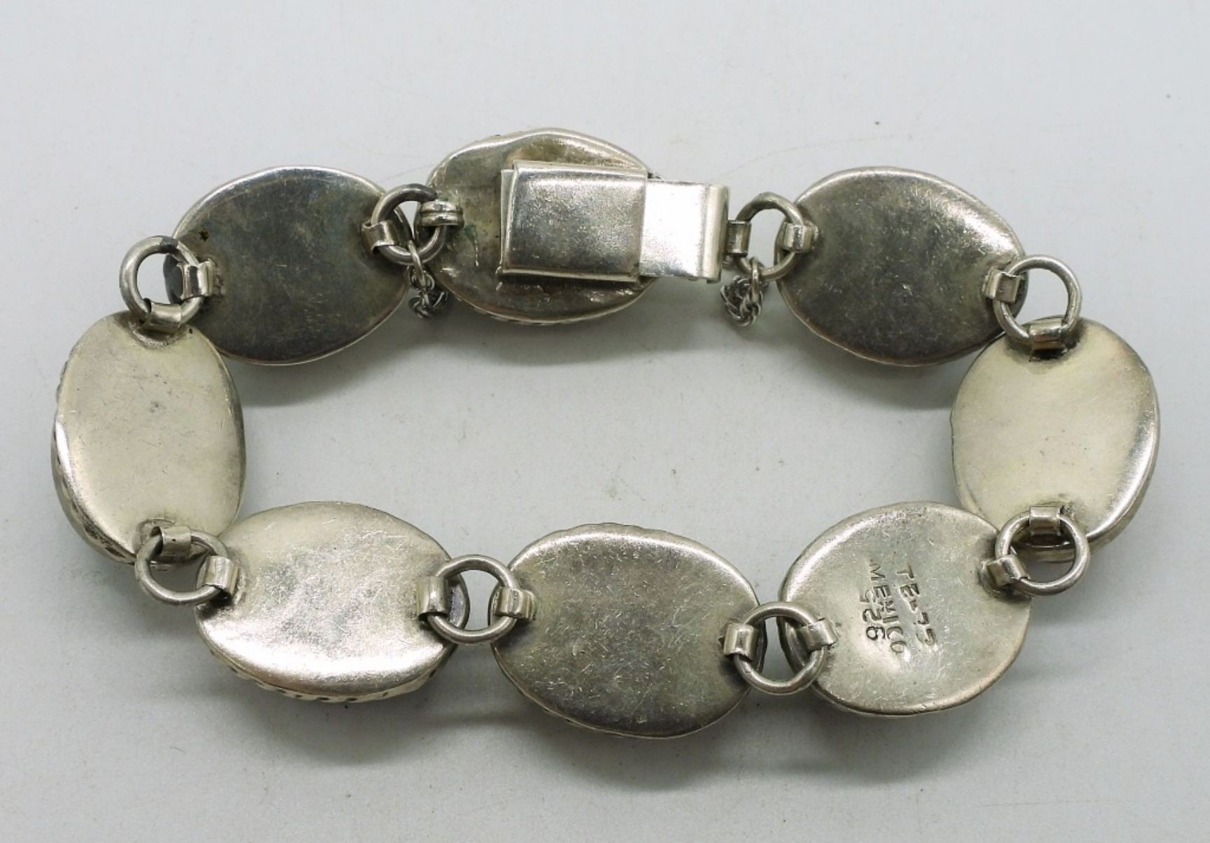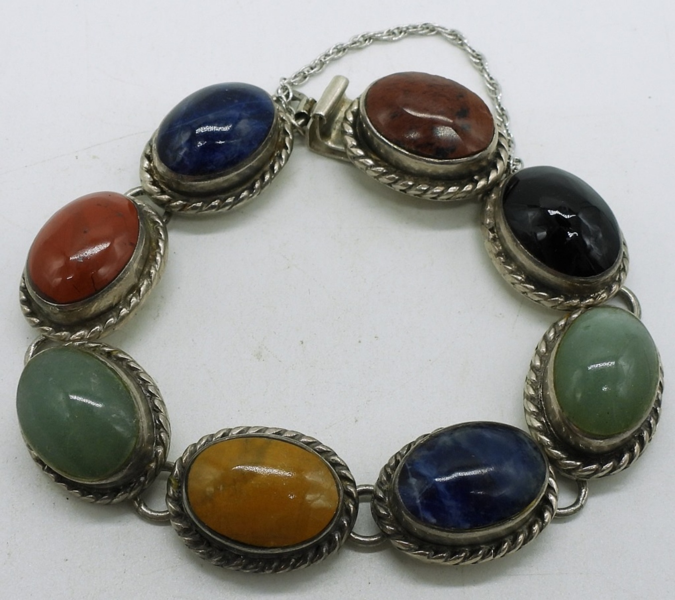 Taxco multi gemstone sterling bracelet with safety chain. Marked “TE-73 ?” 7″. (31.4 dwt)