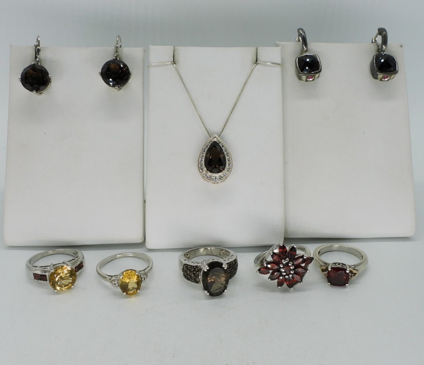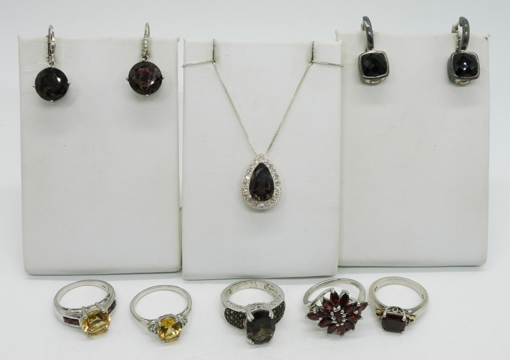 Five sterling rings with Citrine, Smokey Quartz & Garnet gemstones. Sizes 7-9. Two pair sterling pierced earrings. Smokey Quartz necklace, 18″. (24.8 dwt)