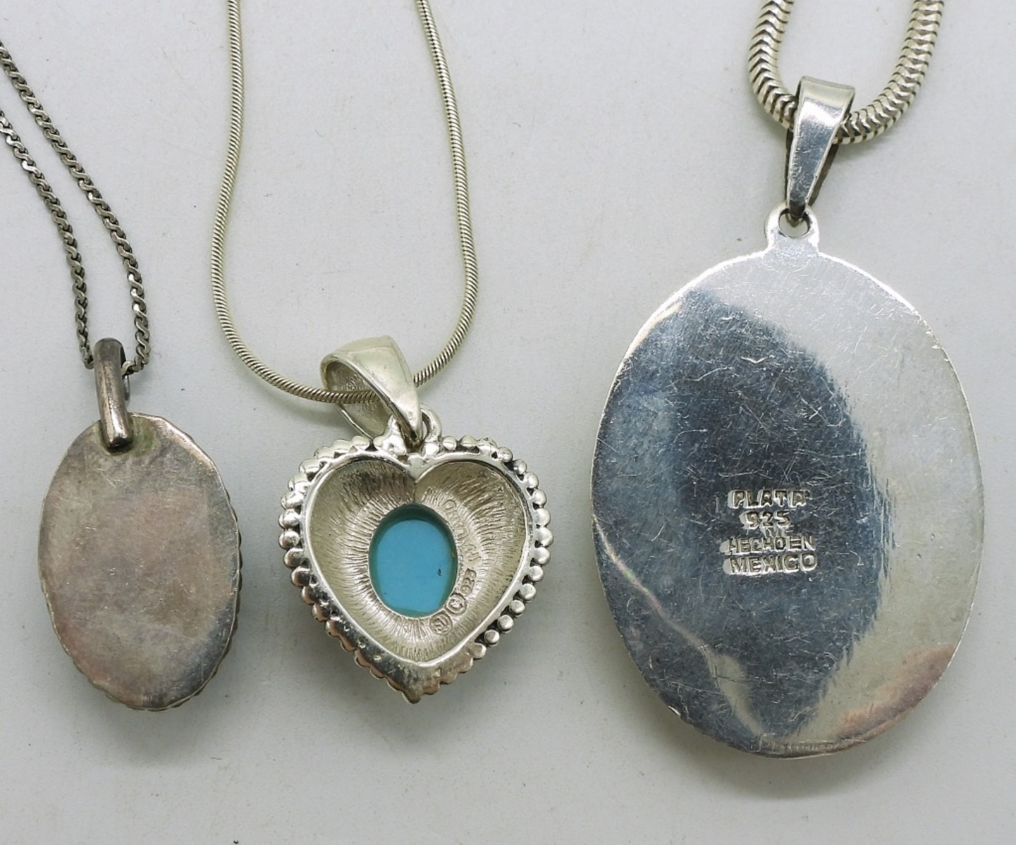 Plata sterling turquoise oval shaped pendant, 2″ long on a 24″ sterling chain. Heart shaped sterling pendant, 1″ on a 16″ chain. Oblong turquoise pendant, 1 1/4″ on a 18″ chain. (25 dwt)