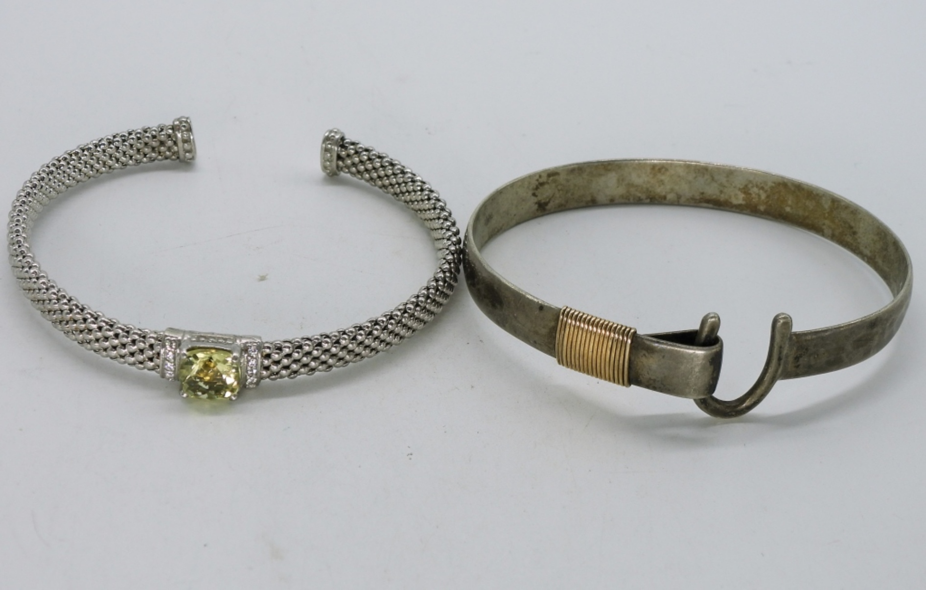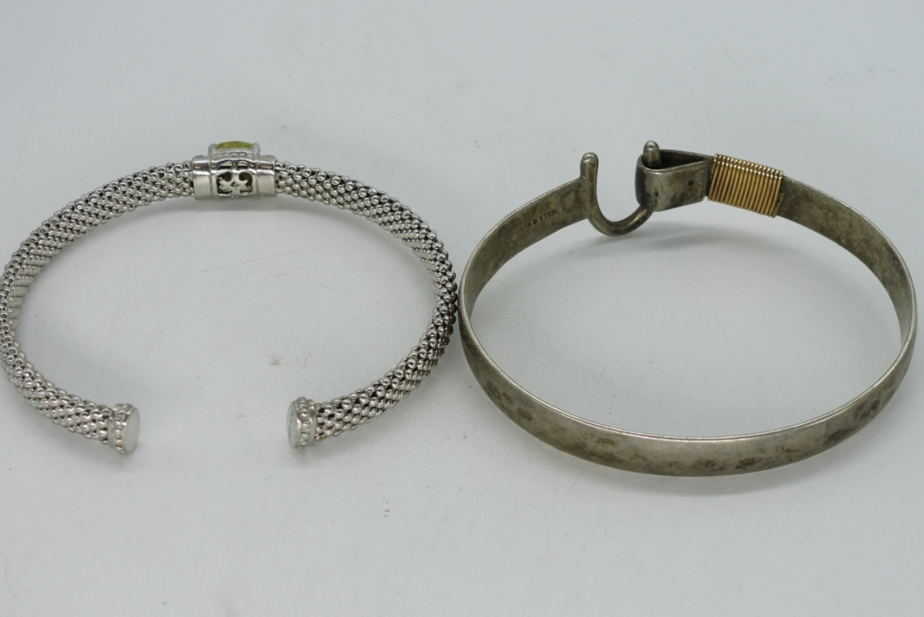 St Croix Hook sterling bracelet marked “Sonya Ster”. Mesh cuff bracelet with a yellow-green gemstone. (23.9 dwt)